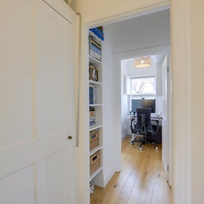 Upstairs, the landing with built-in storage leads to two double bedrooms with bespoke wardrobes, a sleek family bathroom, and a smaller third bedroom, ideal as a nursery or home office. The loft offers additional storage and potential for extension (STPP).