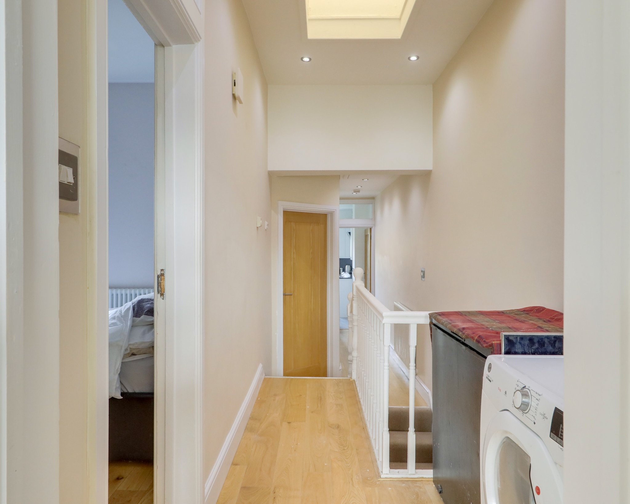 Spotlights, double-glazed windows, wall mounted radiator, wooden flooring.