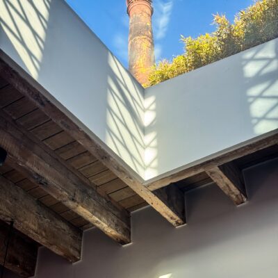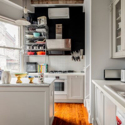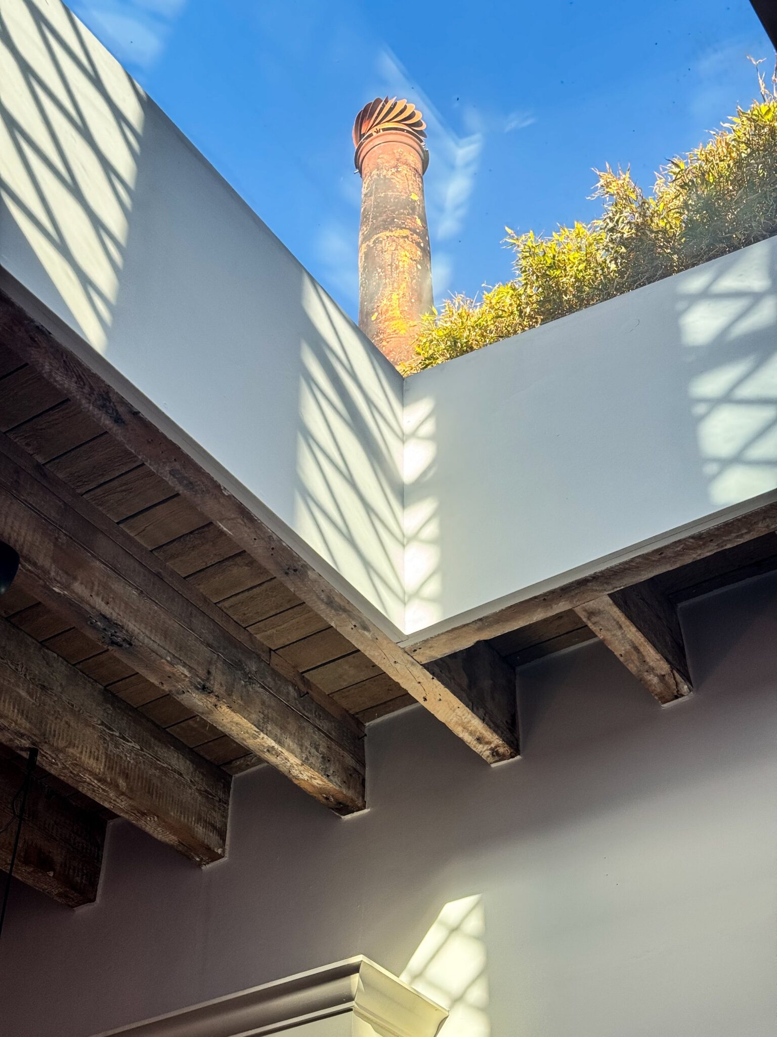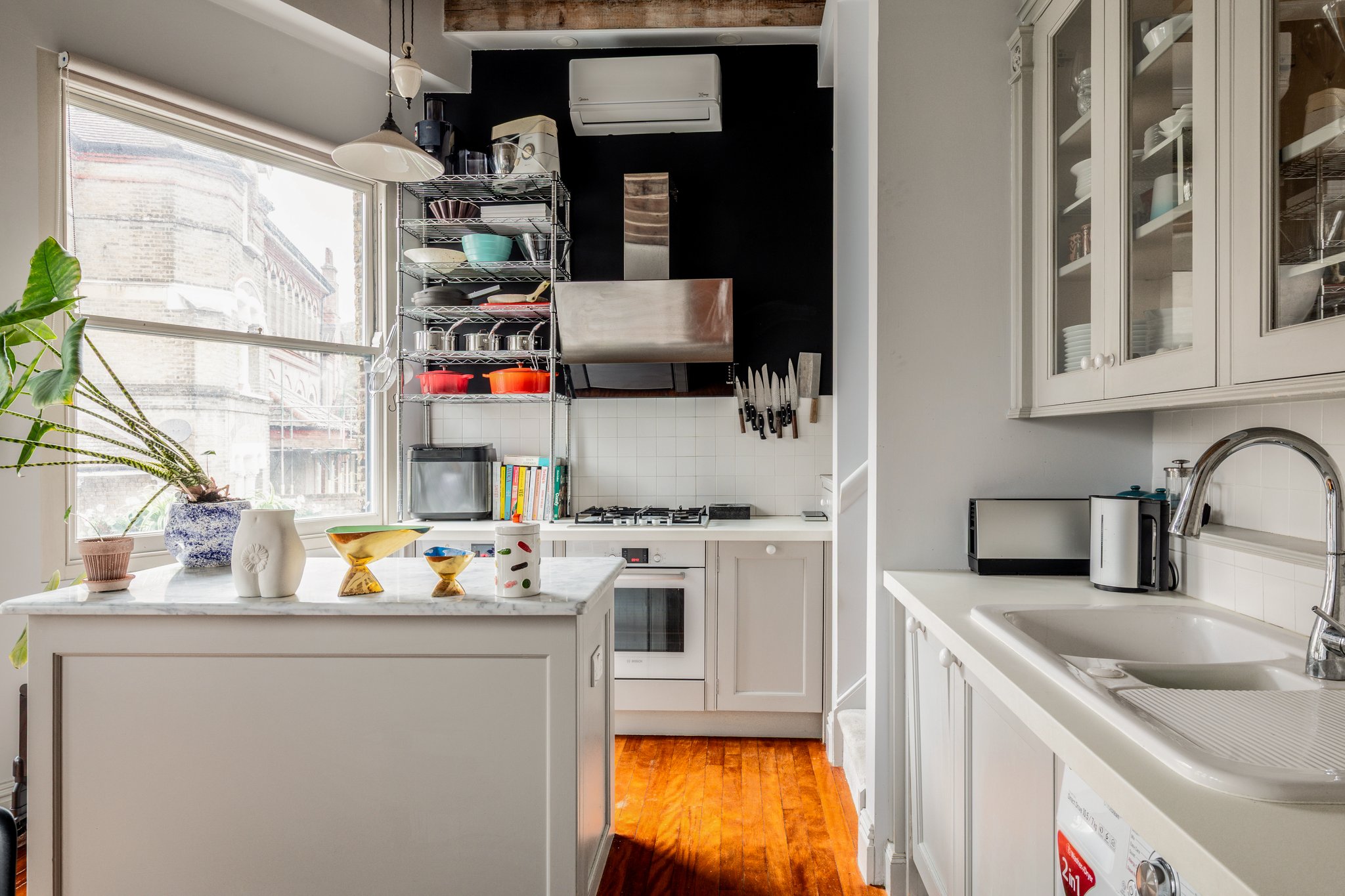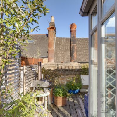 Built in the 1870s by local builder George Kemp as a showroom warehouse, the building retains its red-brick façade and original warehouse doors. Inside, the upper floor unfolds beneath soaring beams and dramatic skylights, with a marble-framed fireplace and Gothic-arched French doors leading to a Juliet balcony. The sleek kitchen, complete with marble surfaces, integrated Bosch appliances, and a central island, opens onto stairs rising to the secluded roof terrace - a tranquil retreat surrounded by bamboo and greenery.