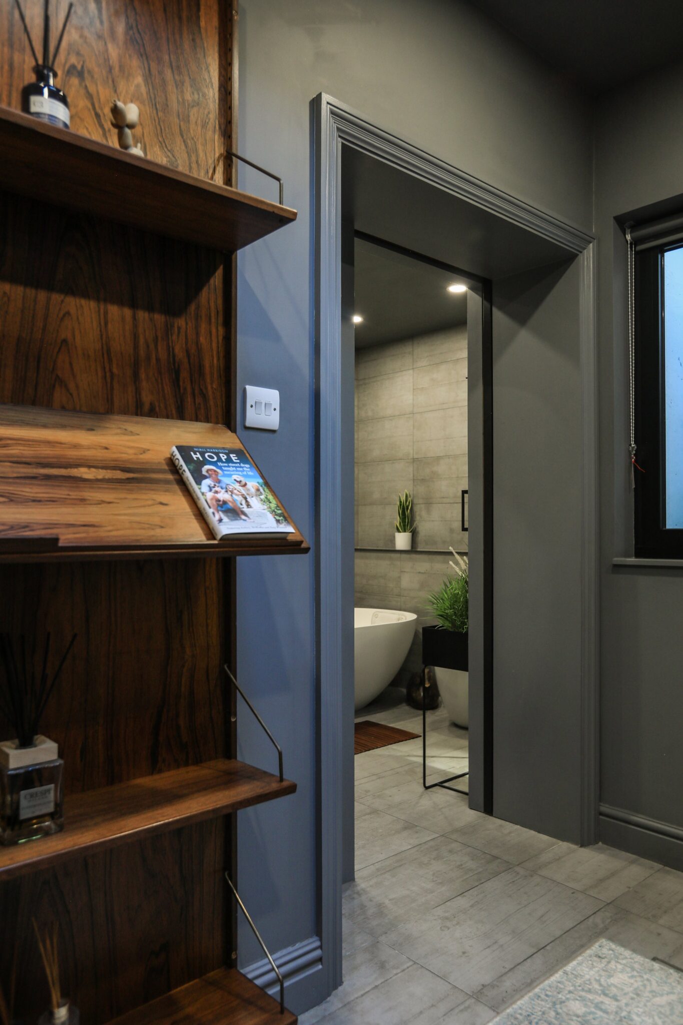 Tiled floor, tiled surround, shower enclosure, low-level WC, fixed wash basin with vanity unit, heated towel rail, under-floor heating, powered extractor, spotlights.