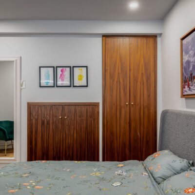 Solid wood flooring, fitted wardrobes, under-floor heating, spotlights, double doors leading to a dressing area/study space.