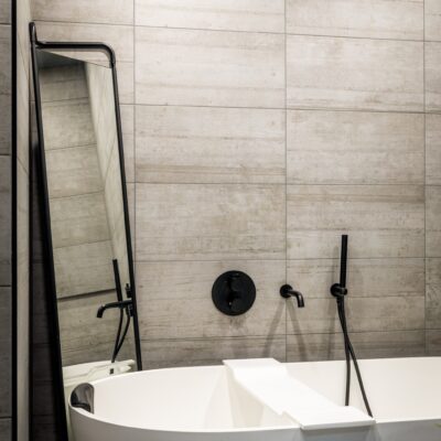 Tiled floor, tiled surround, free-standing stone bath with mixer tap and ceiling-mounted shower head, low-level WC, wash basin with vanity unit, heather towel rail, under-floor heating, spotlights, powered extractor fan.