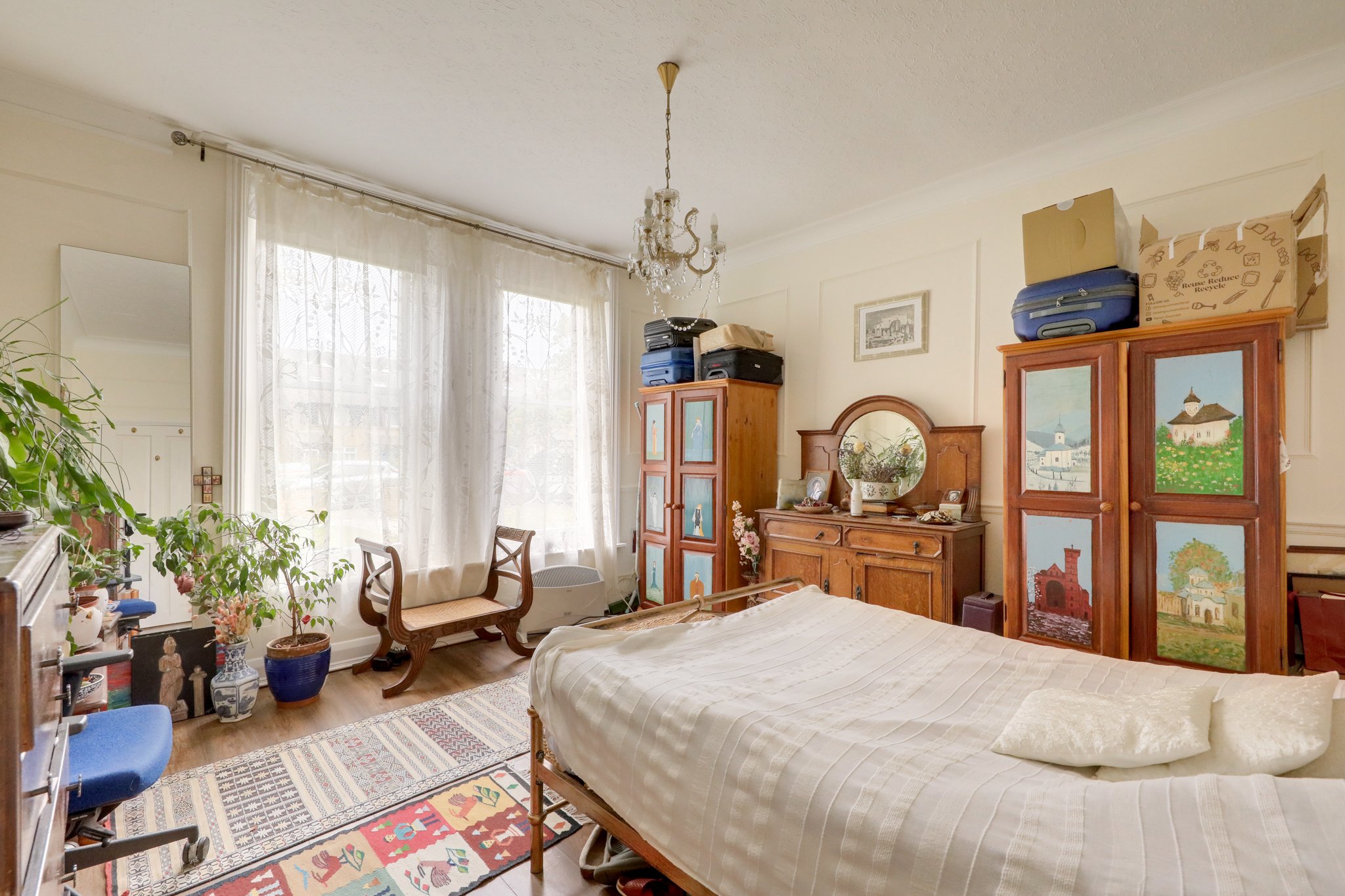Sash windows, ceiling light, radiator, laminate wood flooring.