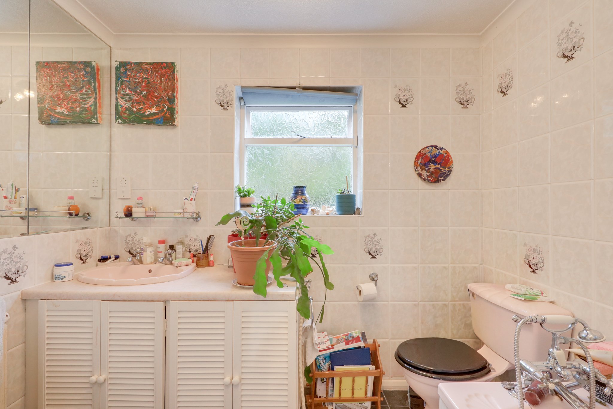 Windows, ceiling light, washbasin on vanity unit, WC, bathtub with shower, radiator, storage cupboard, tile flooring.