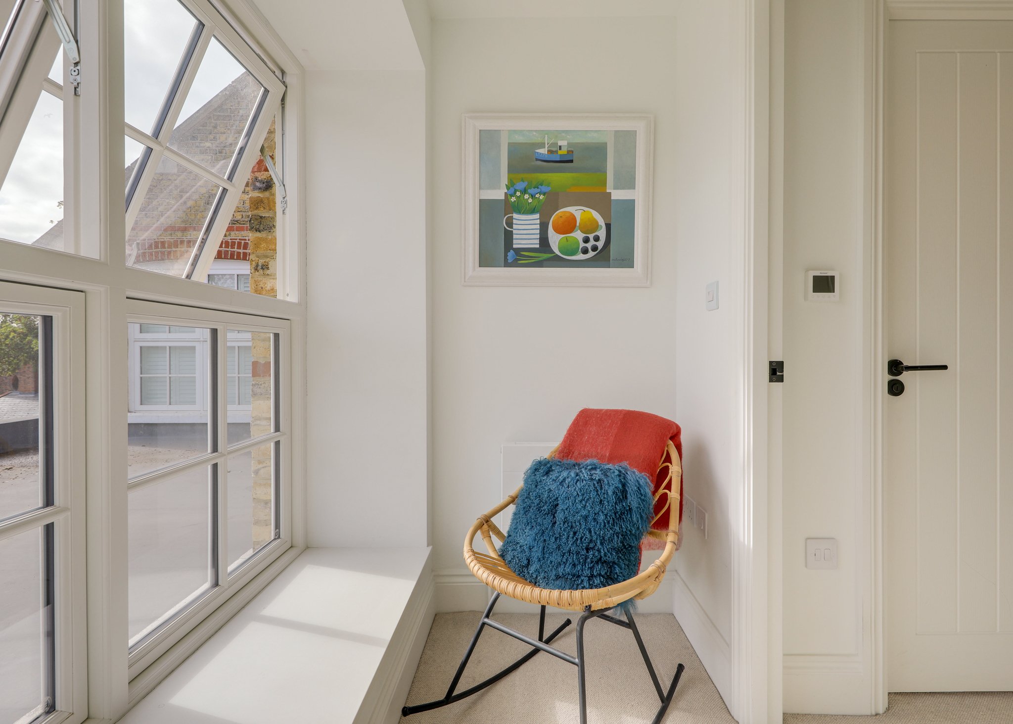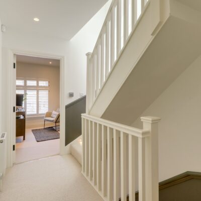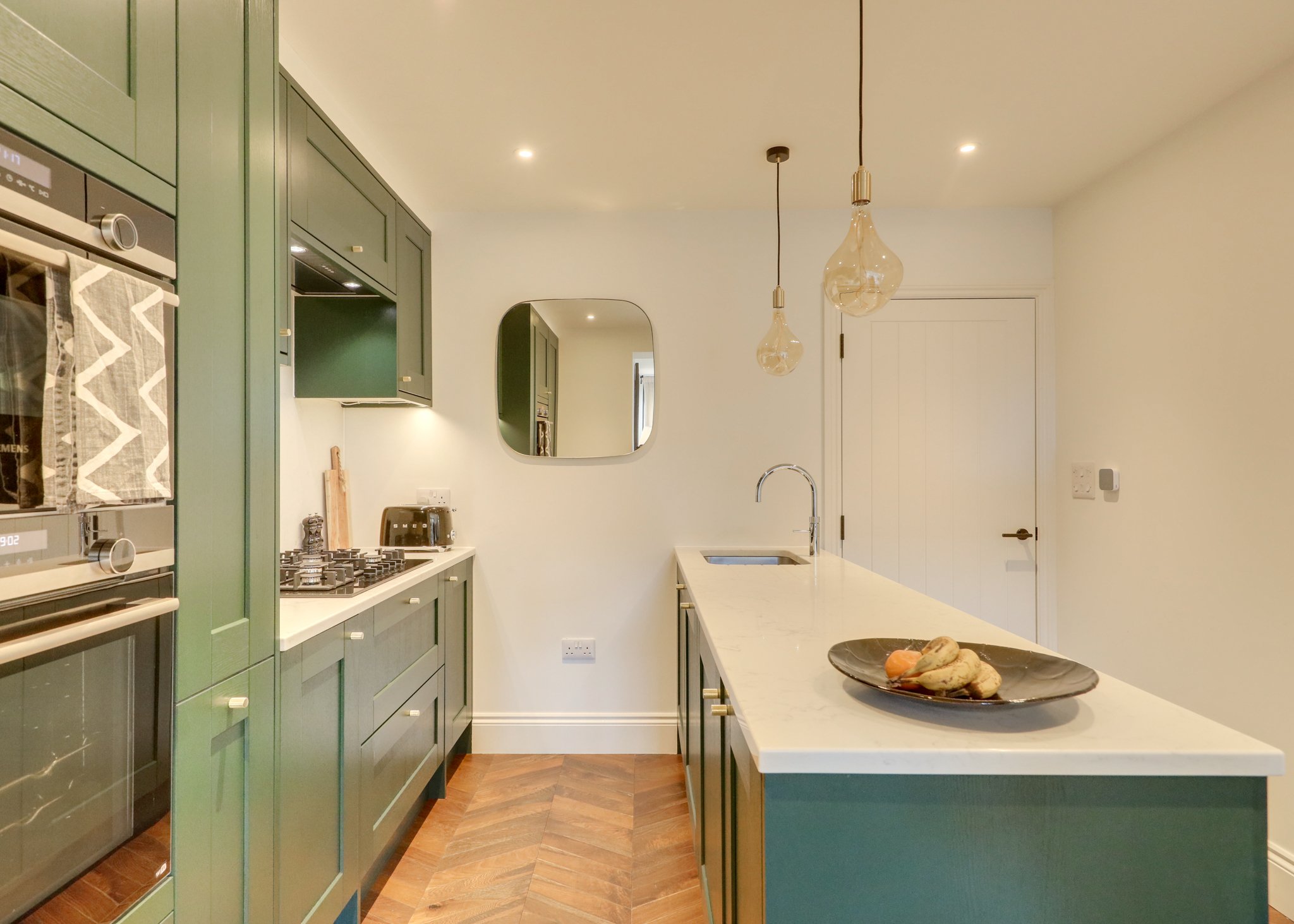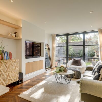 This property offers a generous, open-plan living space that has been finished to an exceptional standard, equipped with an array of bespoke joinery, architectural detailing, and top-of-the-range appliances. The lounge area boasts luxurious herringbone walnut engineered wood flooring, setting a tone of sophisticated comfort. The gourmet kitchen is a chef's delight, featuring sleek quartz work surfaces and a cutting-edge Quooker tap for instant boiling water. Throughout the house, a comprehensive suite of smart solutions has been integrated, including a hive system that controls both heating and lighting, offering effortless modern living.