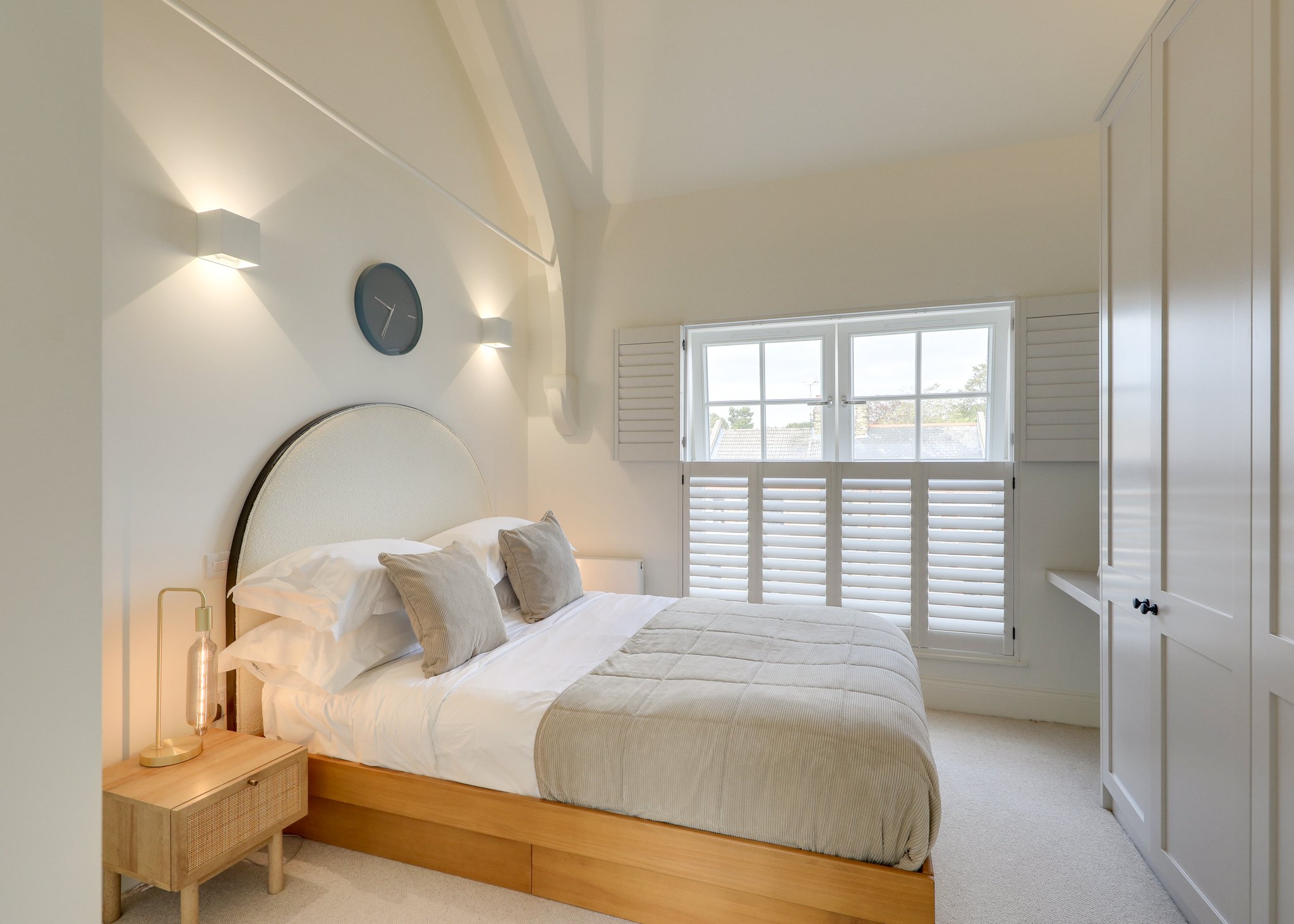 Wall-mounted lights, double-glazed windows with shutters, built-in wardrobe and storage space, radiator, carpet.