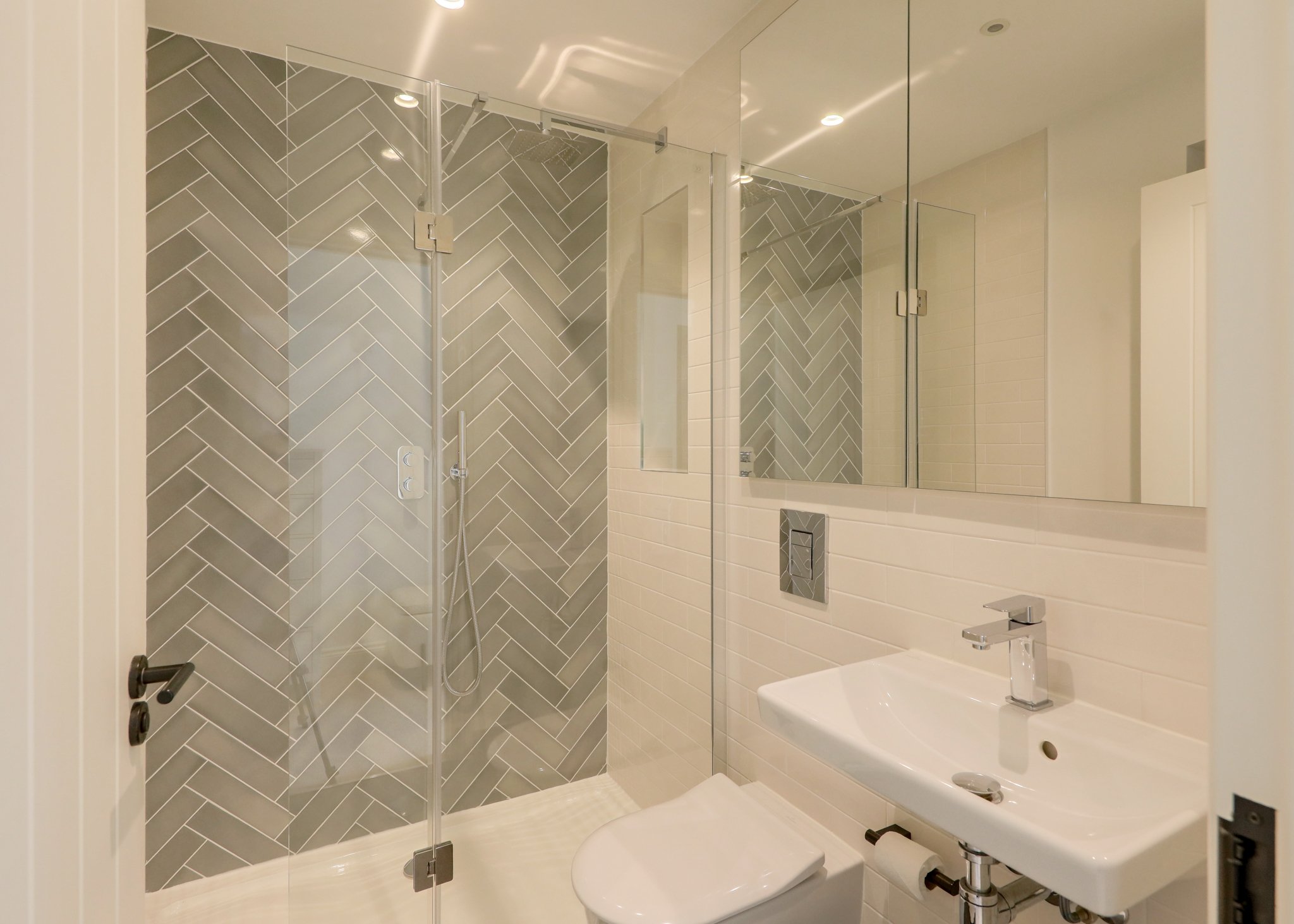 Spotlights, walk in shower with wall-mounted shower head, hidden cistern toilet, alcove unit with attached ceramic basin and mixer tap, tile floor.