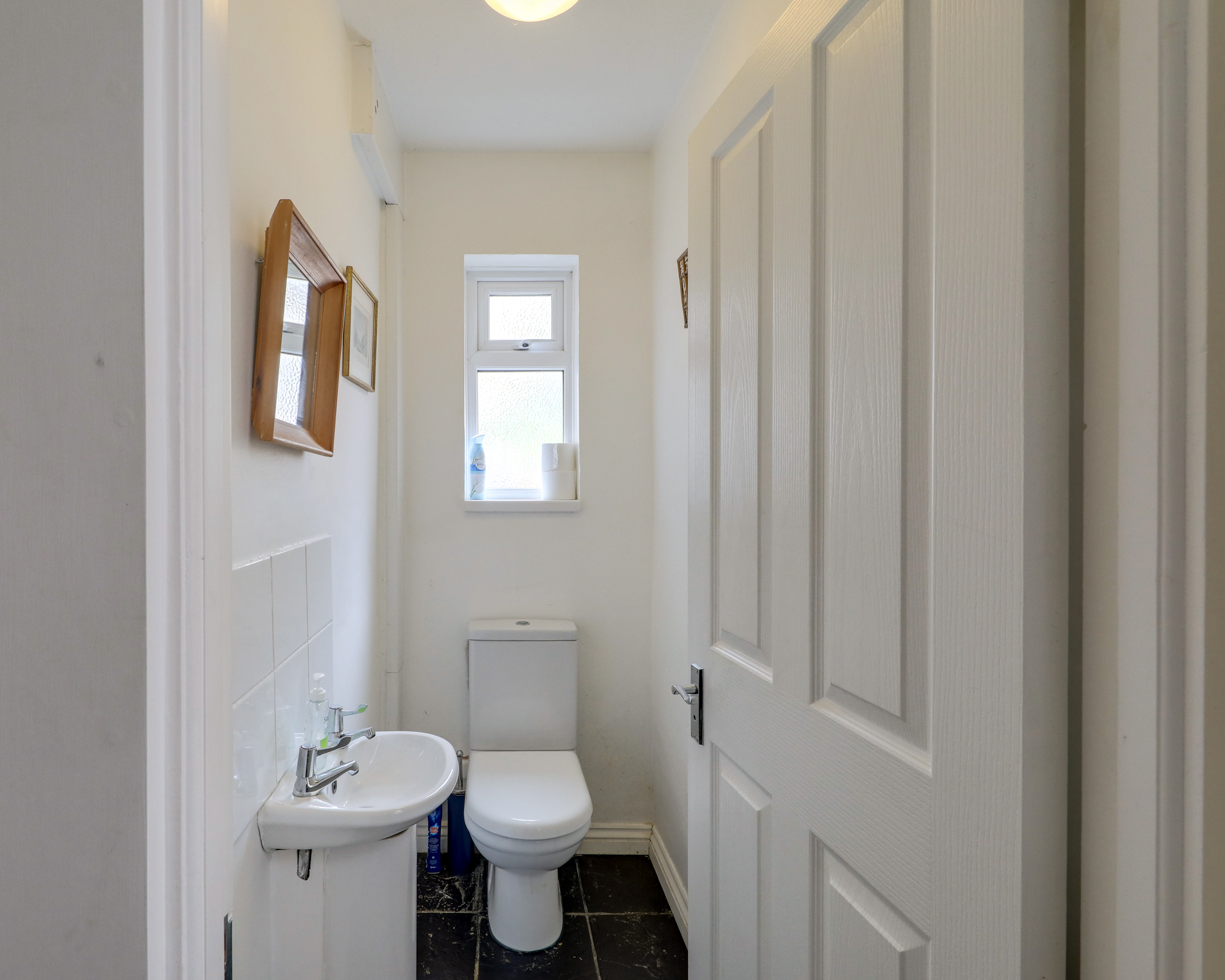 Pendant light, window, toilet, sink with mixer taps, splashback tile, tiled flooring.