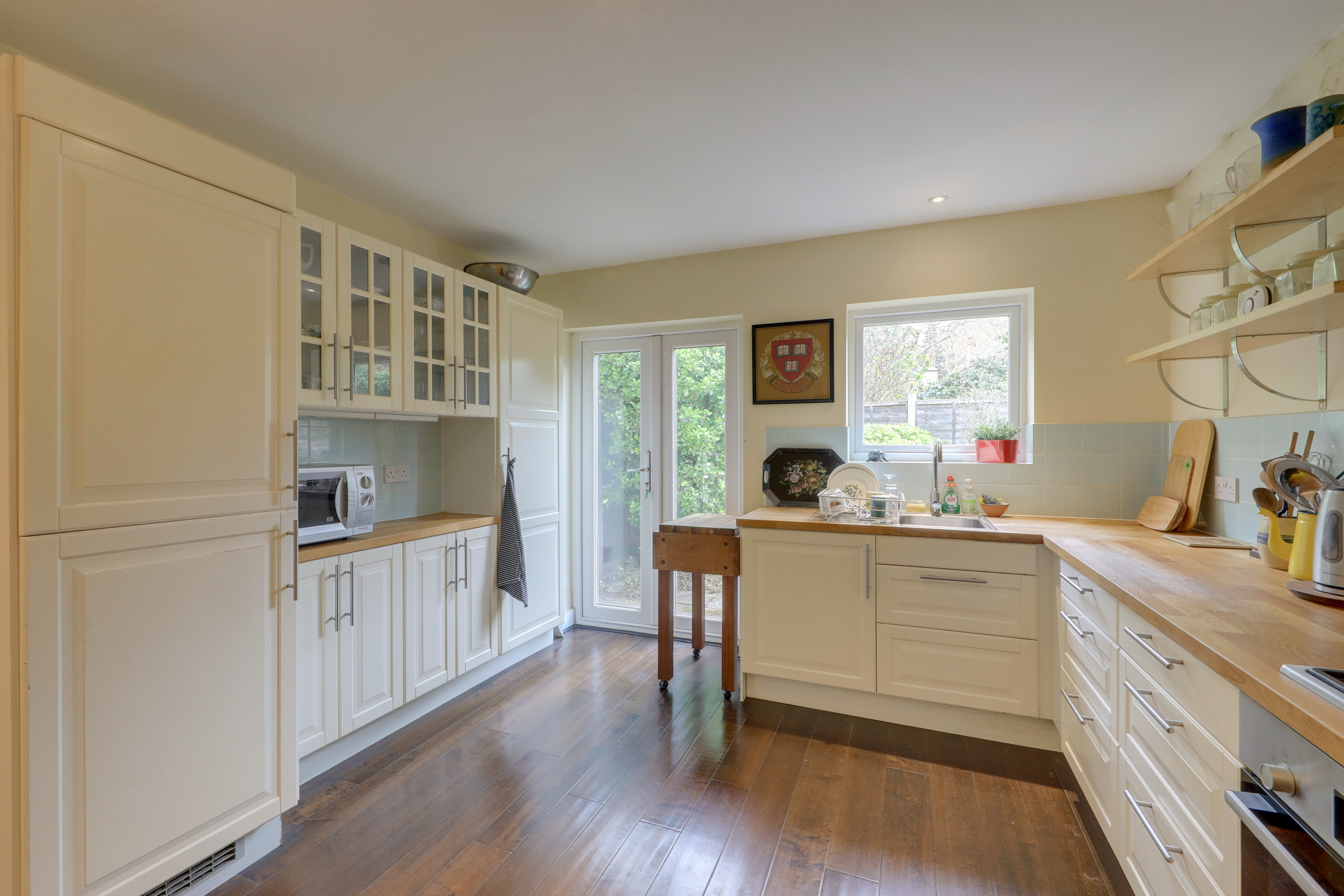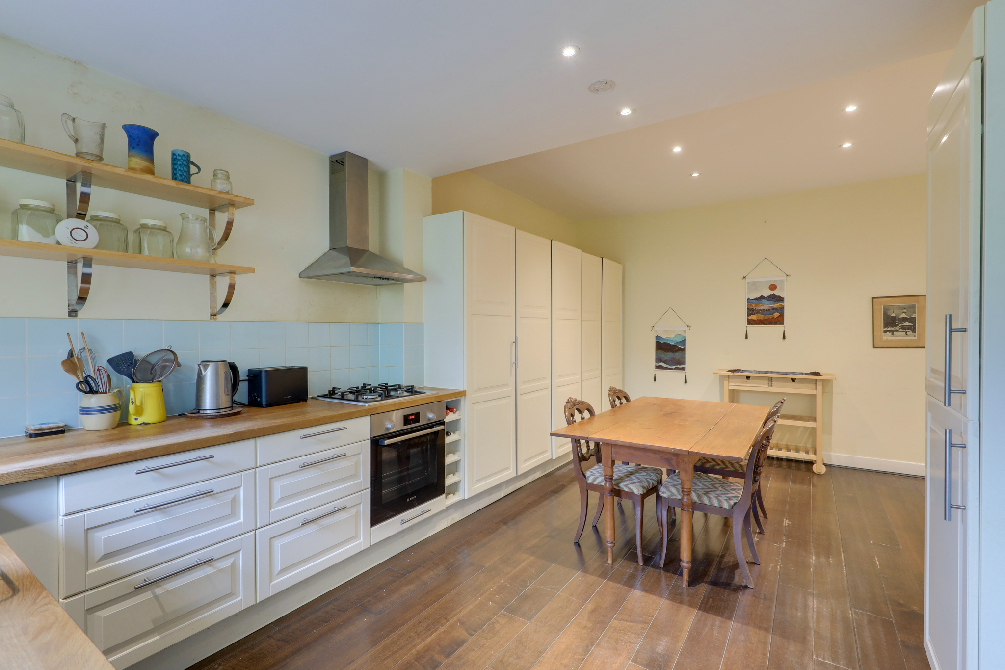 Dimmable spotlights, matching base and wall units, integrated dishwasher, oven, gas hob and fridge/freezer, fitted cupboards with ample storage, shelving, sink with mixer tap, radiator, window, wood floor.