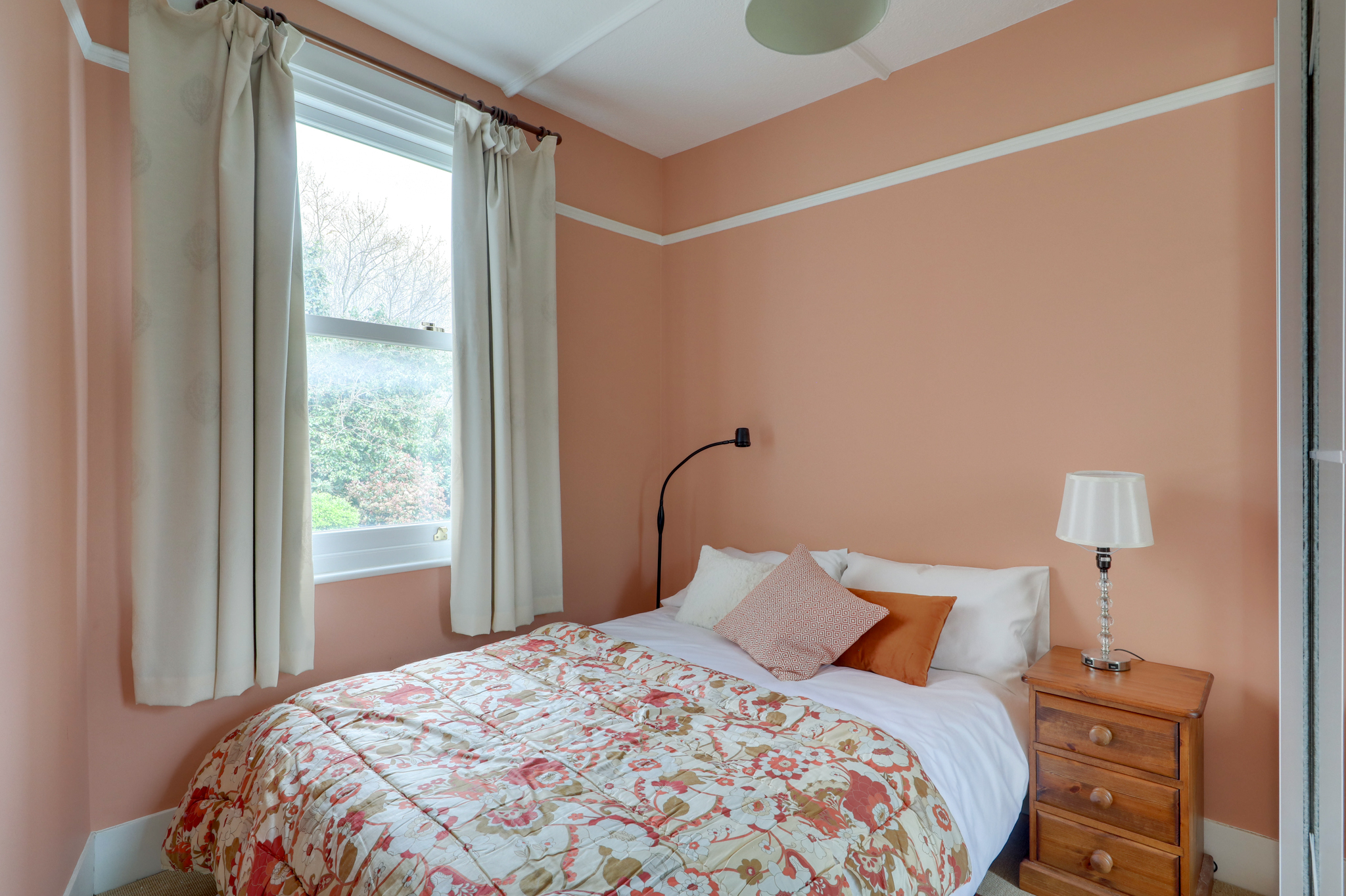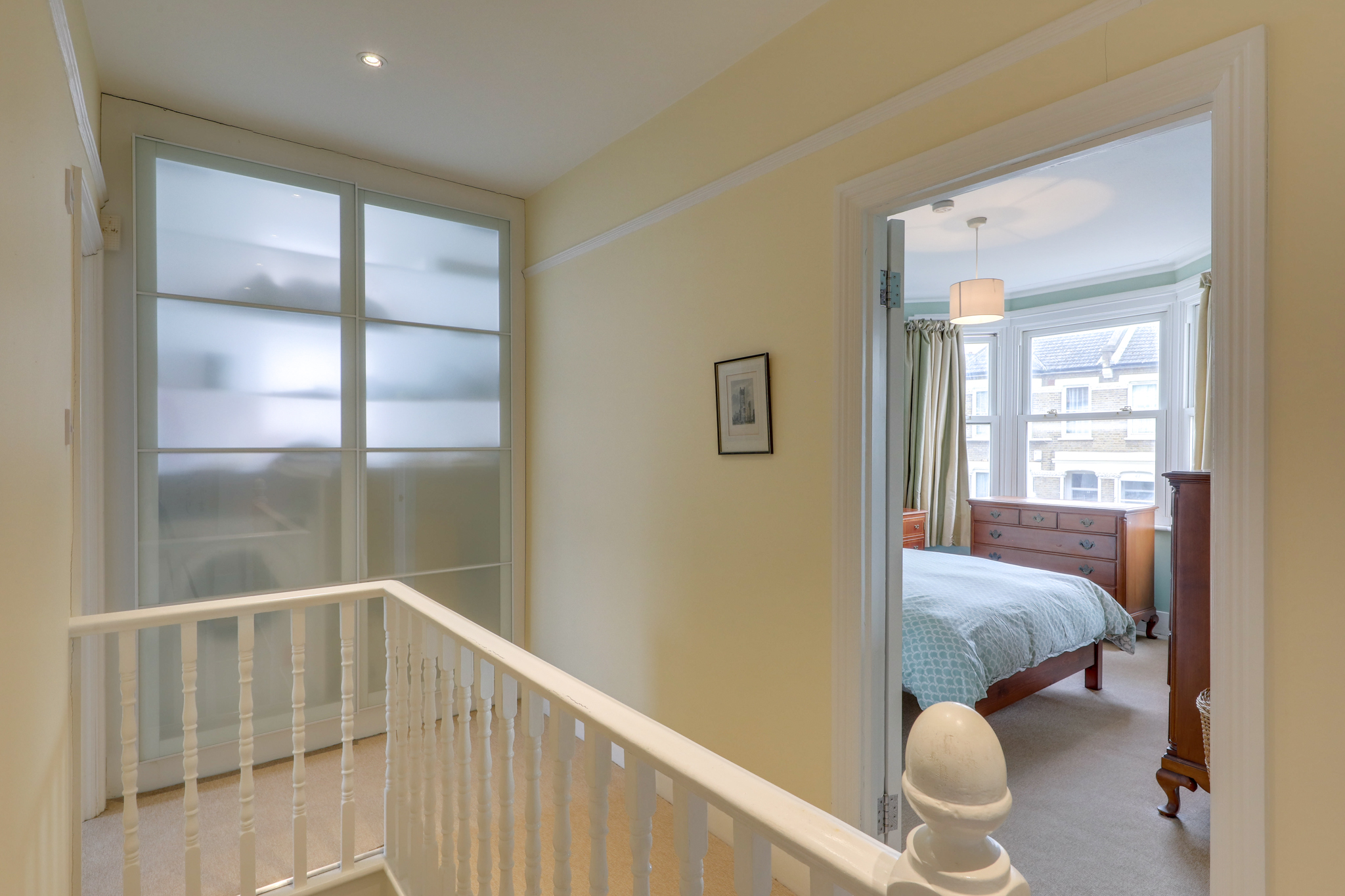 Pendant light, bay window, alcove space with fitted shelving, carpet.