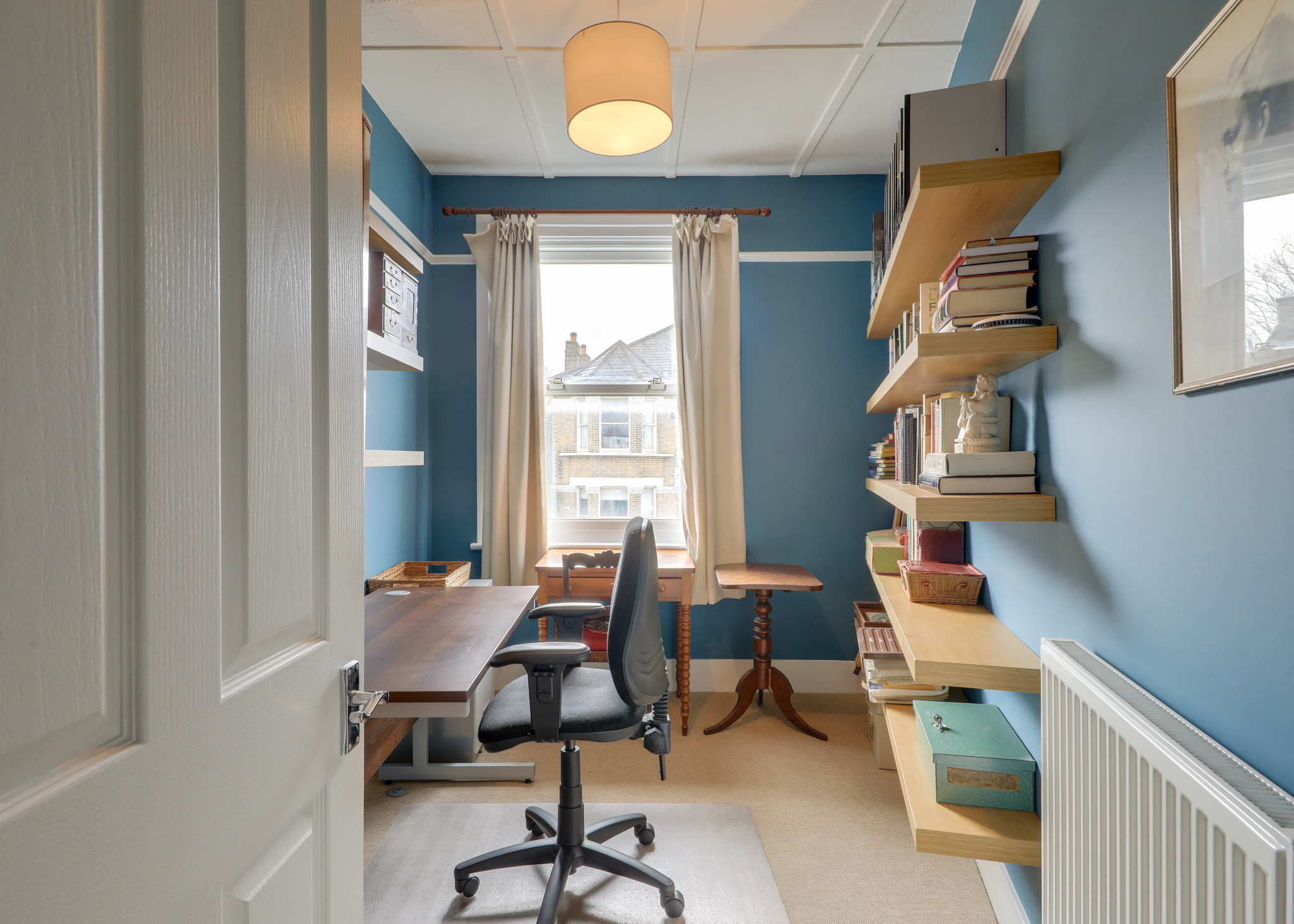 Pendant light, window, radiator, shelving, carpet.