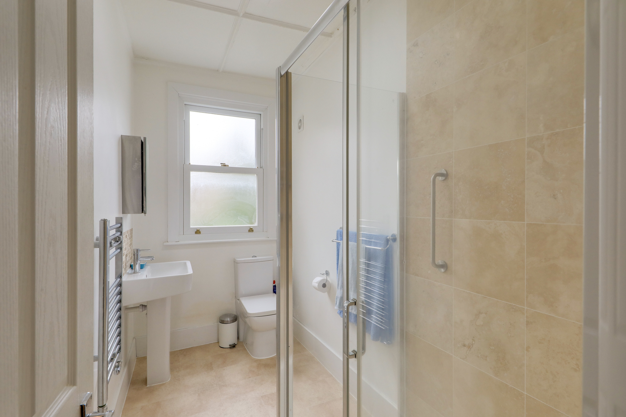 Ceiling light, window, toilet, sink basin with mixer tap, shower with glass door and tiled walls, wall-mounted heated towel rail, tiled flooring.