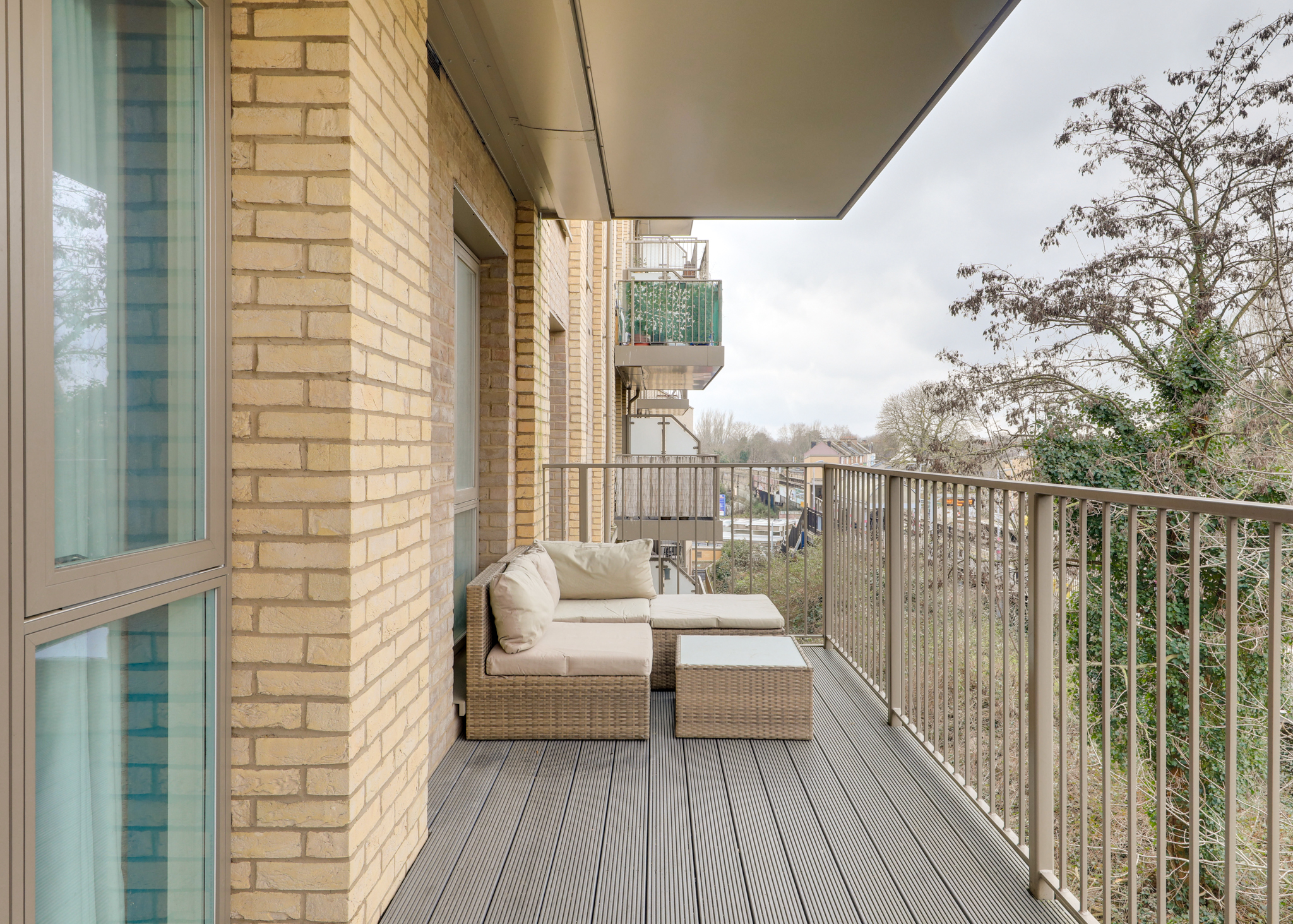 There are two good-sized double bedrooms, a modern bathroom, and an open-plan kitchen and living area that works well for everyday living as well as having friends over. The living space benefits from large windows, which bring in plenty of natural light and help the flat feel open and welcoming. The private balcony extends the living area outdoors and is a real bonus, catching the afternoon and evening sun — ideal for relaxing after work. There is also a useful utility cupboard and an additional storage cupboard, providing space for drying laundry and keeping things neatly tucked away. Set in an elevated position, the flat feels calm and private, while still being very well connected. The flat also has an allocated parking space in the development.