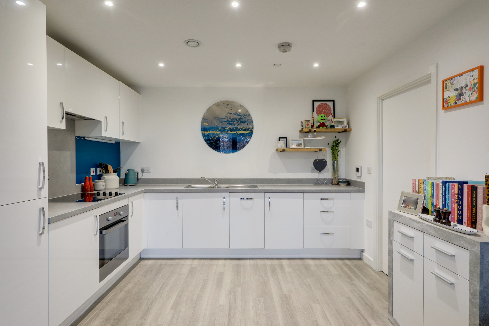 Spotlights, matching base and wall units, integrated fridge, integrated oven and hob, sink with mixer tap, amtico laminate flooring.