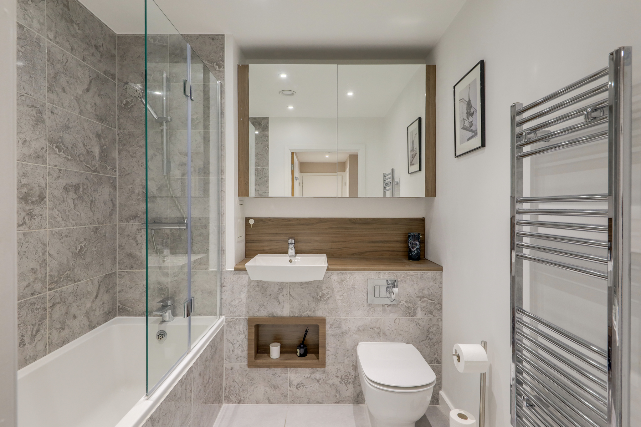 Spotlights, bath tub with shower head and mixer taps, hidden cistern toilet, tile walls, built in unit with sink and mixer tap, large storage cupboard, wall-mounted heated towel rail, tile floor.