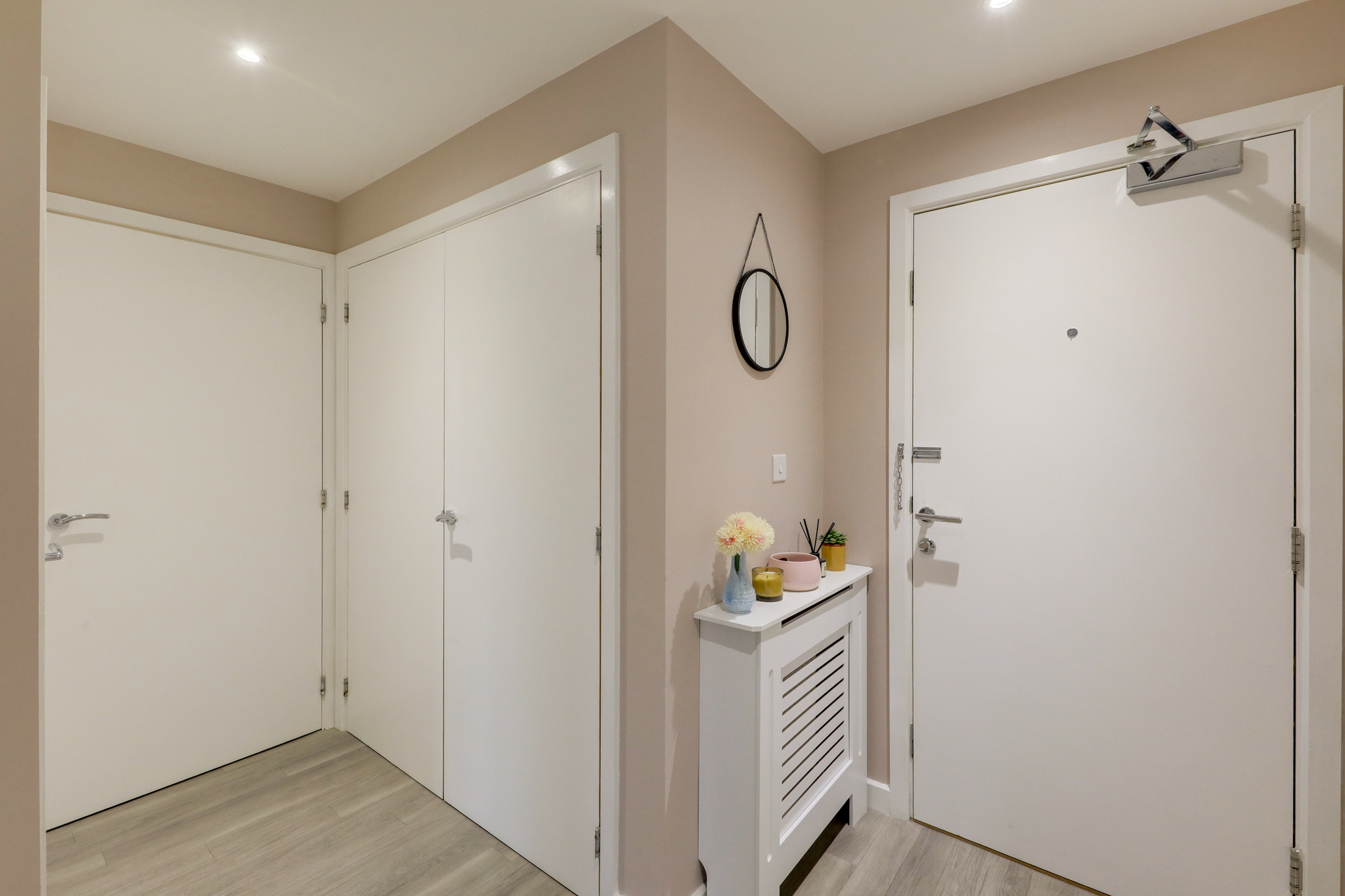 Pendant light, door windows leading to balcony, radiator, Amtico laminate floor.