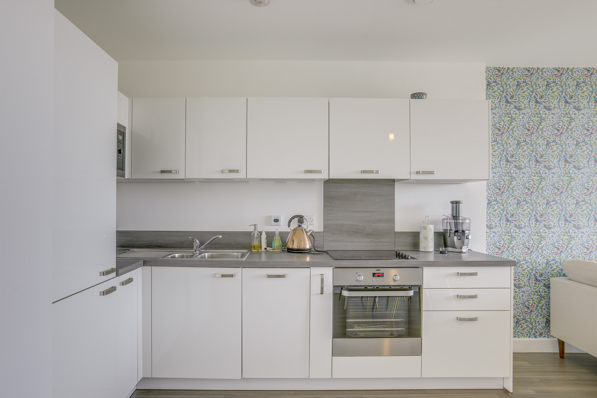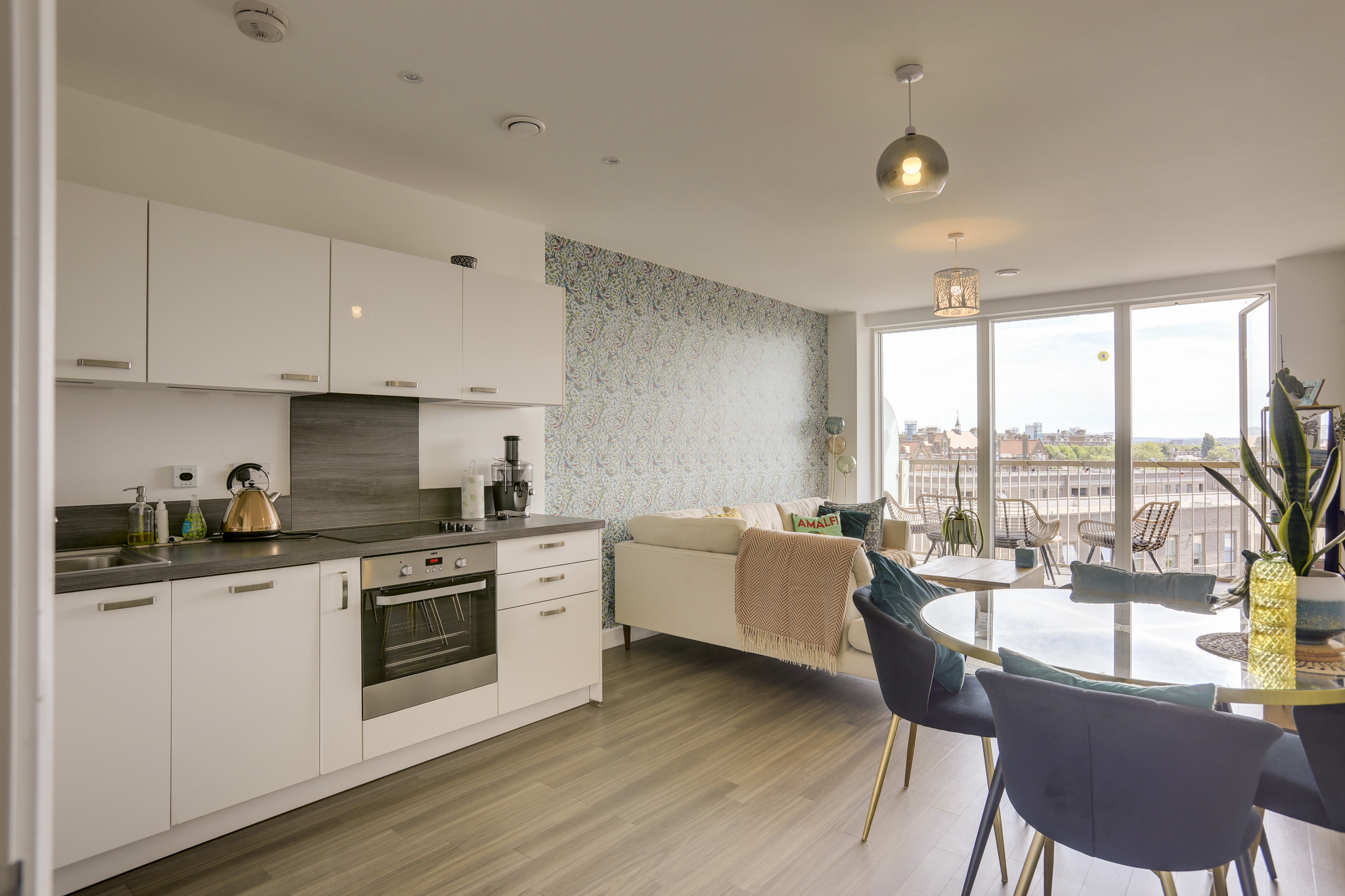 A welcoming entrance hall leads into a spacious open-plan living area with a sleek integrated kitchen and plenty of room for dining. Floor-to-ceiling windows flood the space with natural light and open onto a private balcony — perfect for relaxing and taking in the far-reaching views. The generous double bedroom features built-in wardrobes, while the contemporary bathroom, utility cupboard, and additional storage add to the home’s convenience. The property also benefits from an allocated parking space.