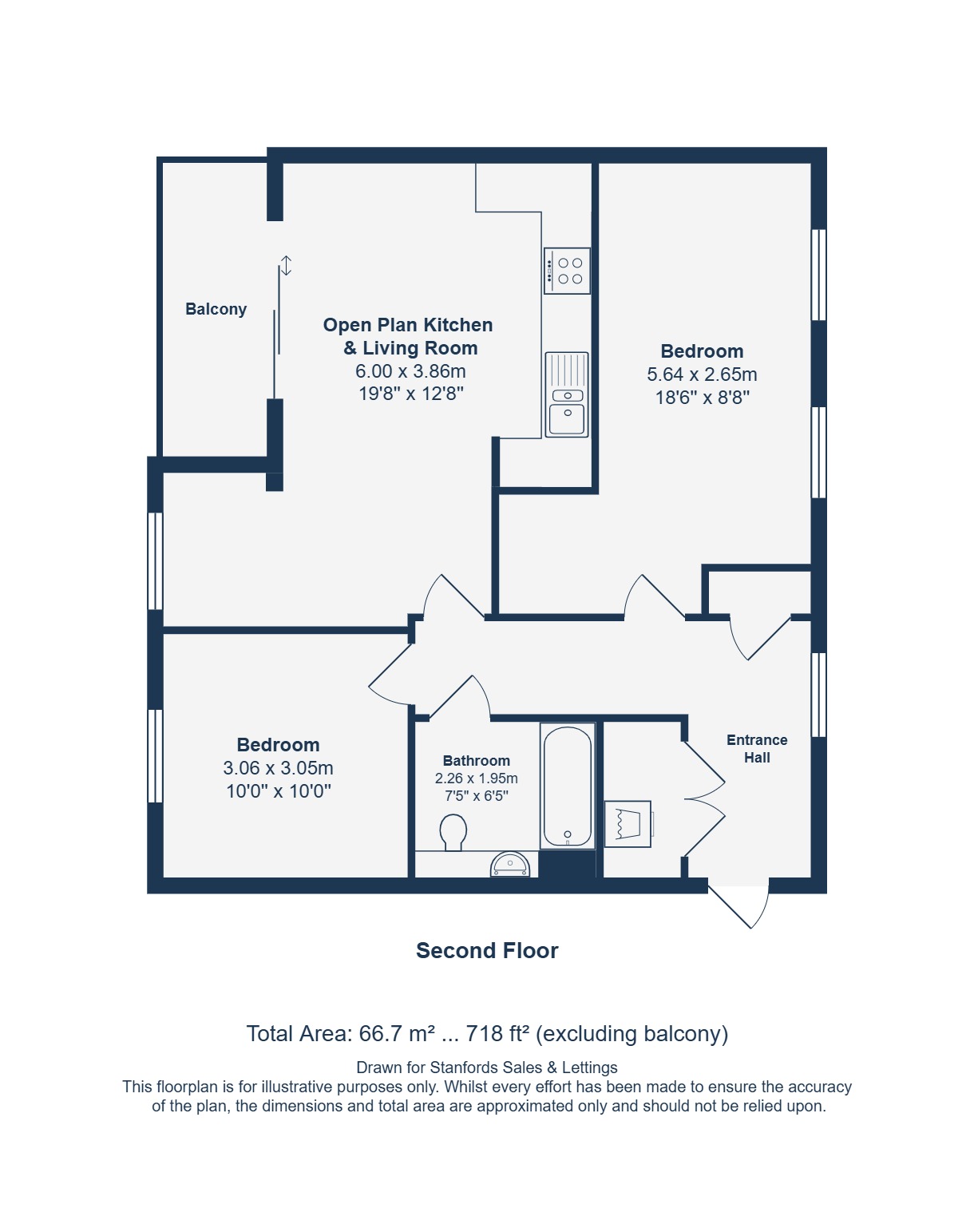The flat features a bright open-plan living and kitchen area with integrated appliances, opening onto a private balcony—ideal for relaxing or entertaining. There are two generous double bedrooms, a contemporary bathroom, and a useful utility closet along with additional hallway storage, providing practical everyday convenience.