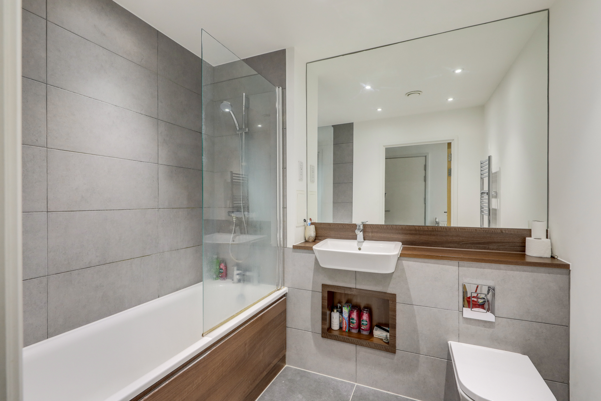 Inset ceiling spotlights, bathtub with shower and screen, washbasin on vanity unit, WC, heated towel rail, tile flooring.