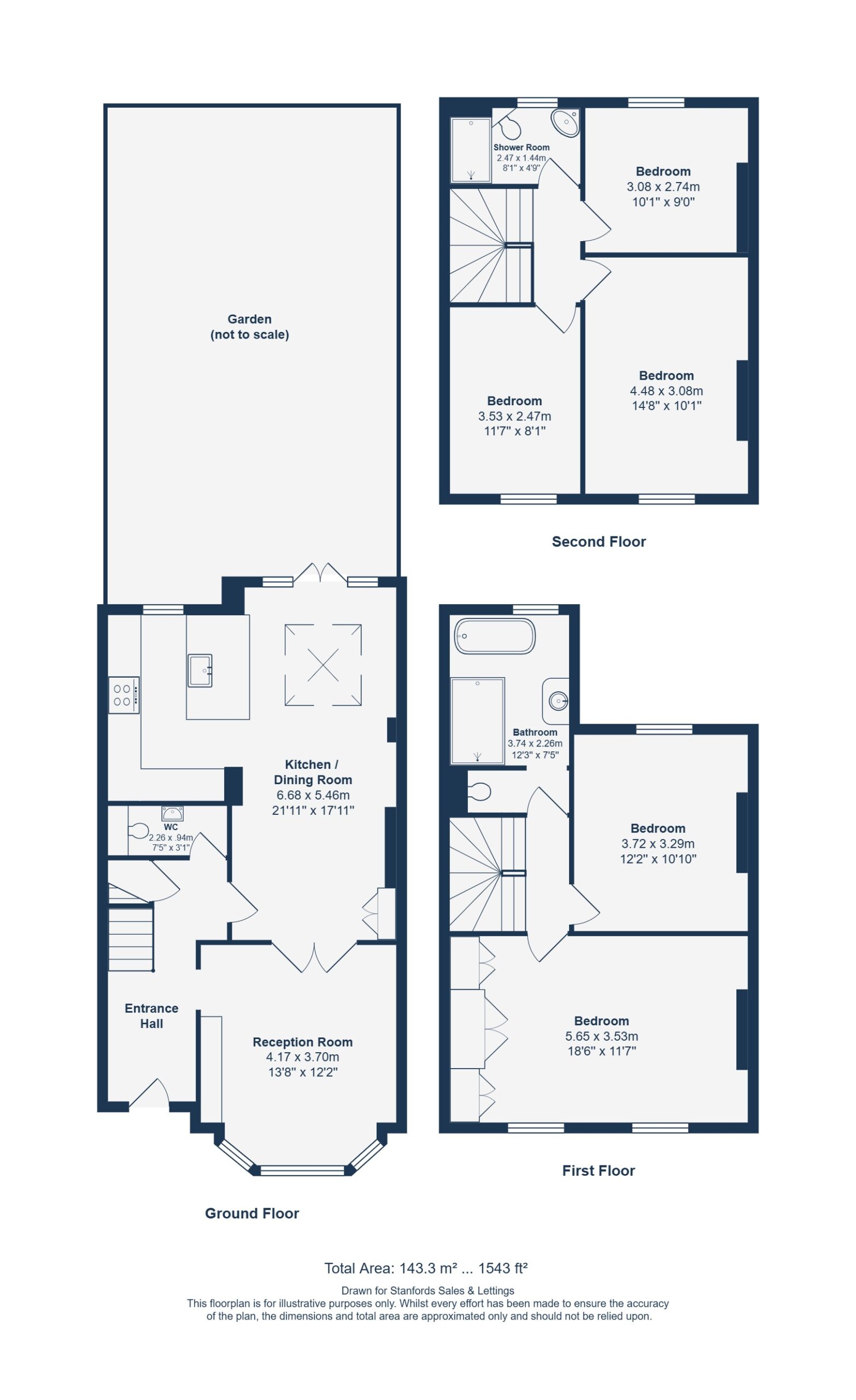 The ground floor opens with a light-filled reception room to the front, with the kitchen/dining room positioned at the rear and opening directly onto the garden. A guest WC completes this level. On the first floor, two bedrooms are complemented by a family bathroom, while the second floor holds three further bedrooms and a shower room, offering flexibility for children, guests, or workspaces.