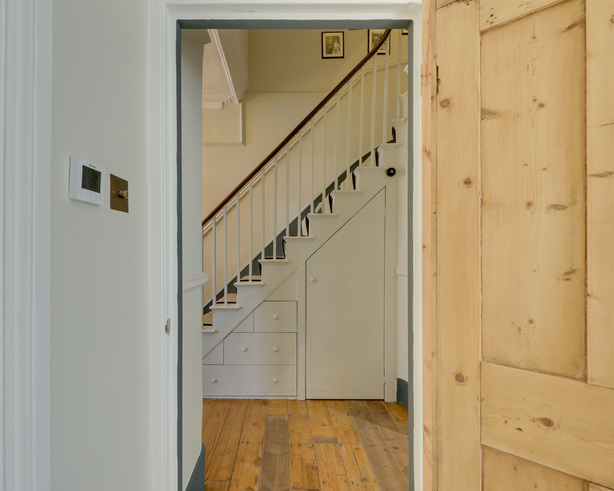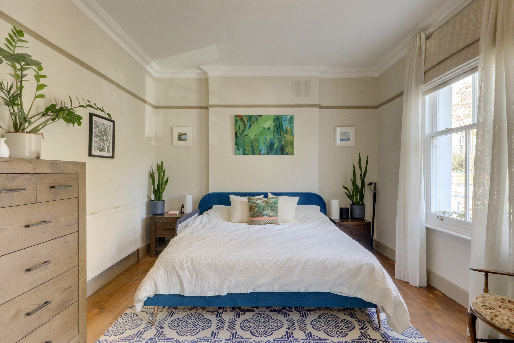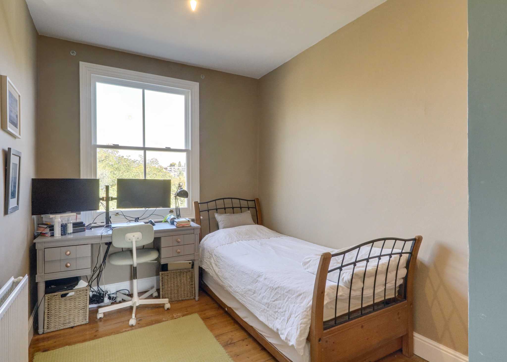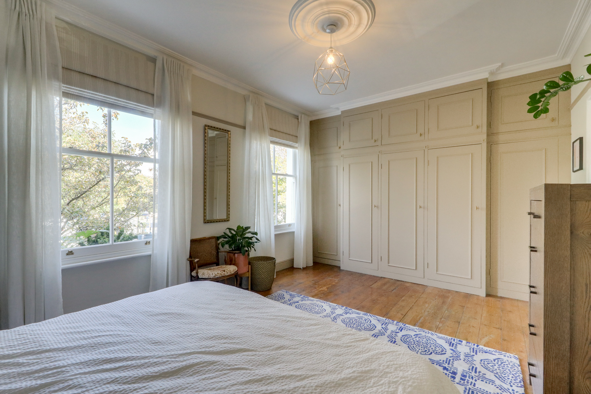 Pendant light, double-glazed windows, bult-in storage wardrobes, radiator, wood floor.