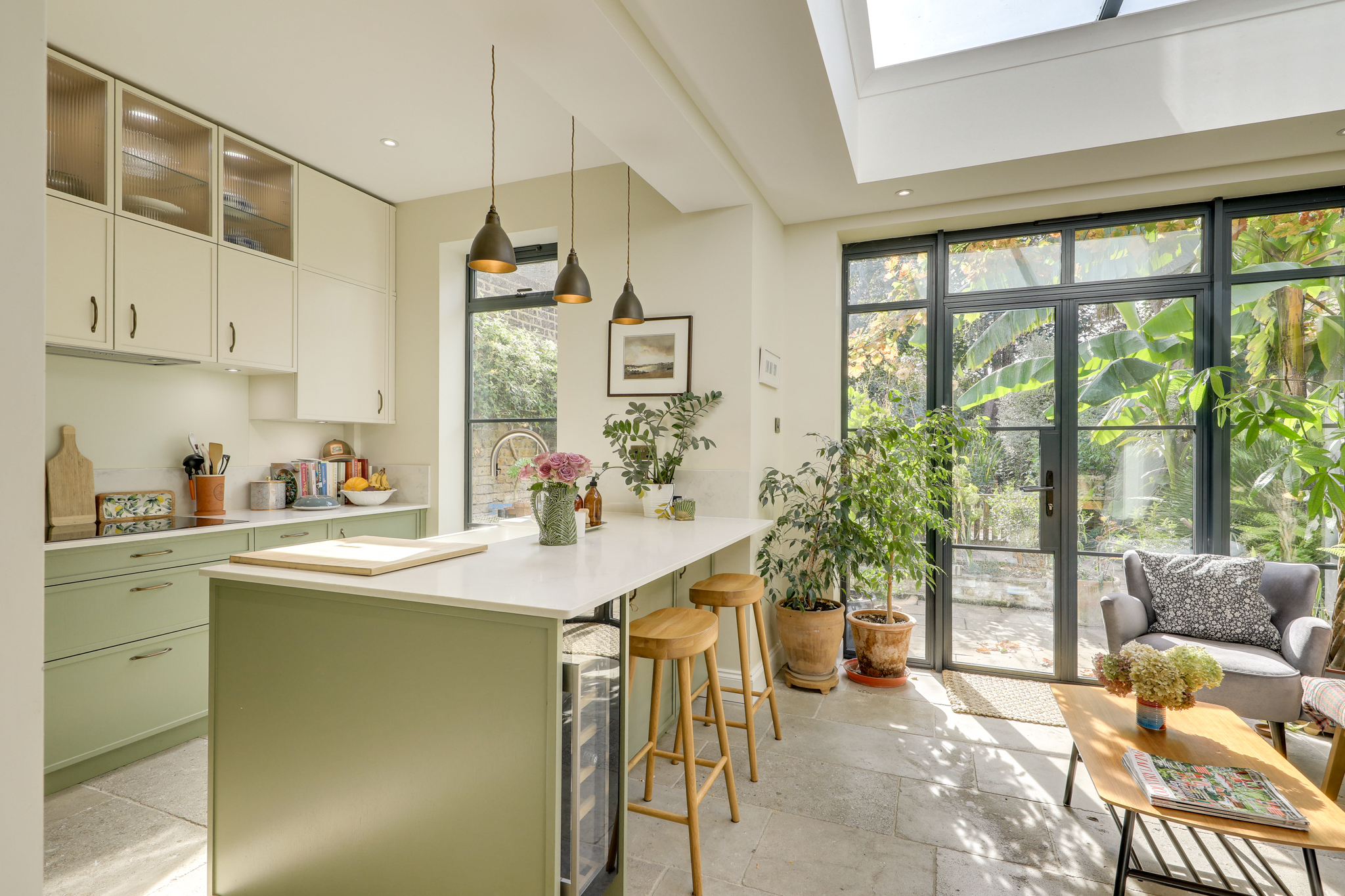 Spotlights, pendant lights, double-glazed windows and door to garden, fitted wall cupboards and matching counters, integrated fridge in cupboard, integrated dishwasher, cooker and hob, built-in basin with stainless steele mixer tap located on the island, wine cooler, concreate floor.