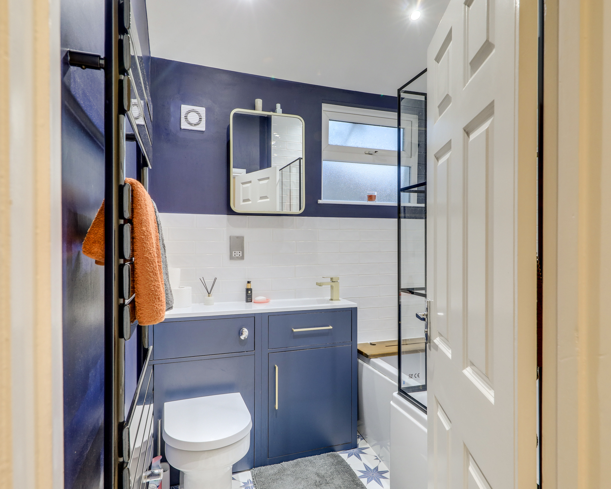 Double-glazed window, inset ceiling spotlights, bathtub with shower and screen, washbasin on vanity unit, WC, heated towel rail, tile flooring.