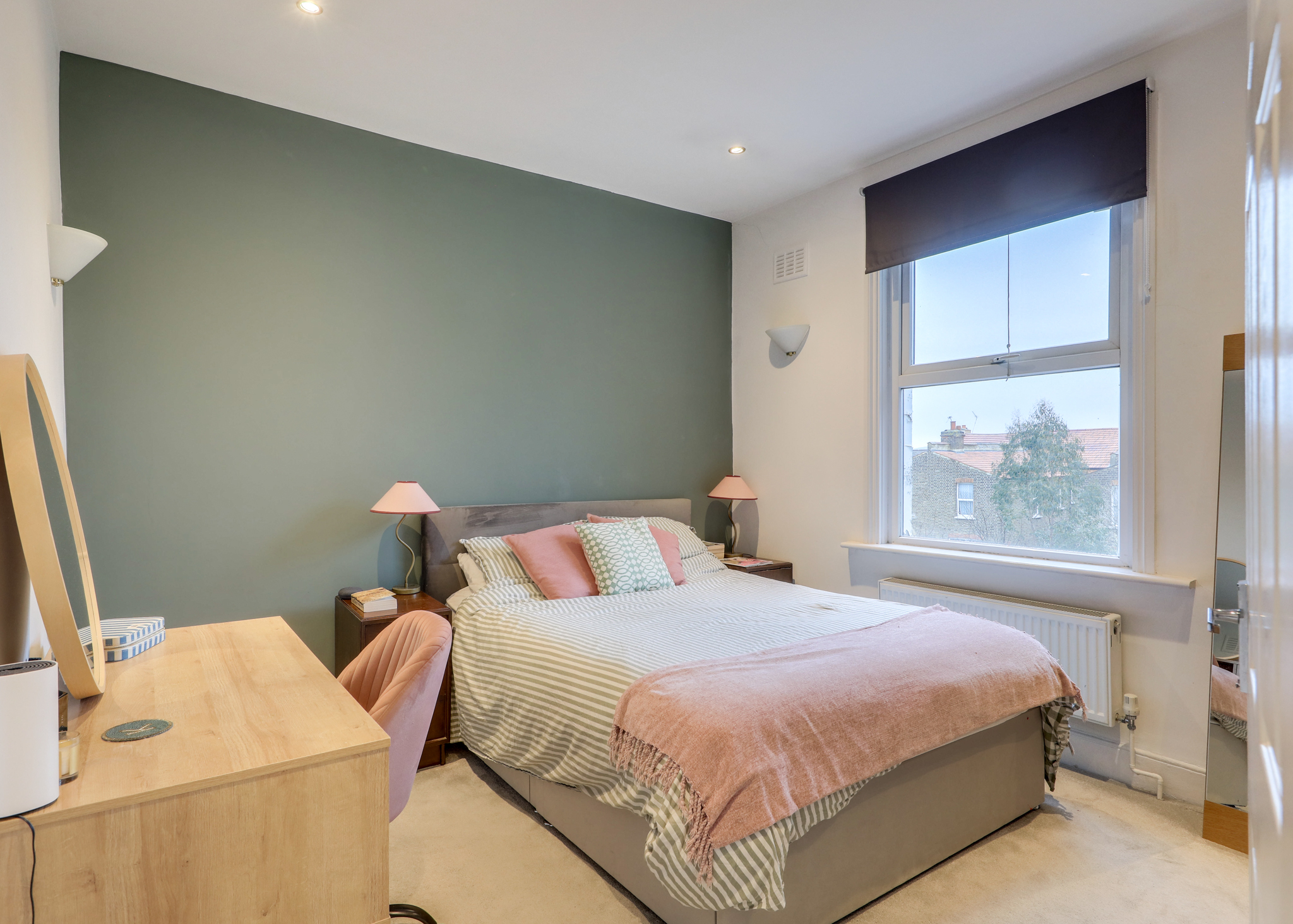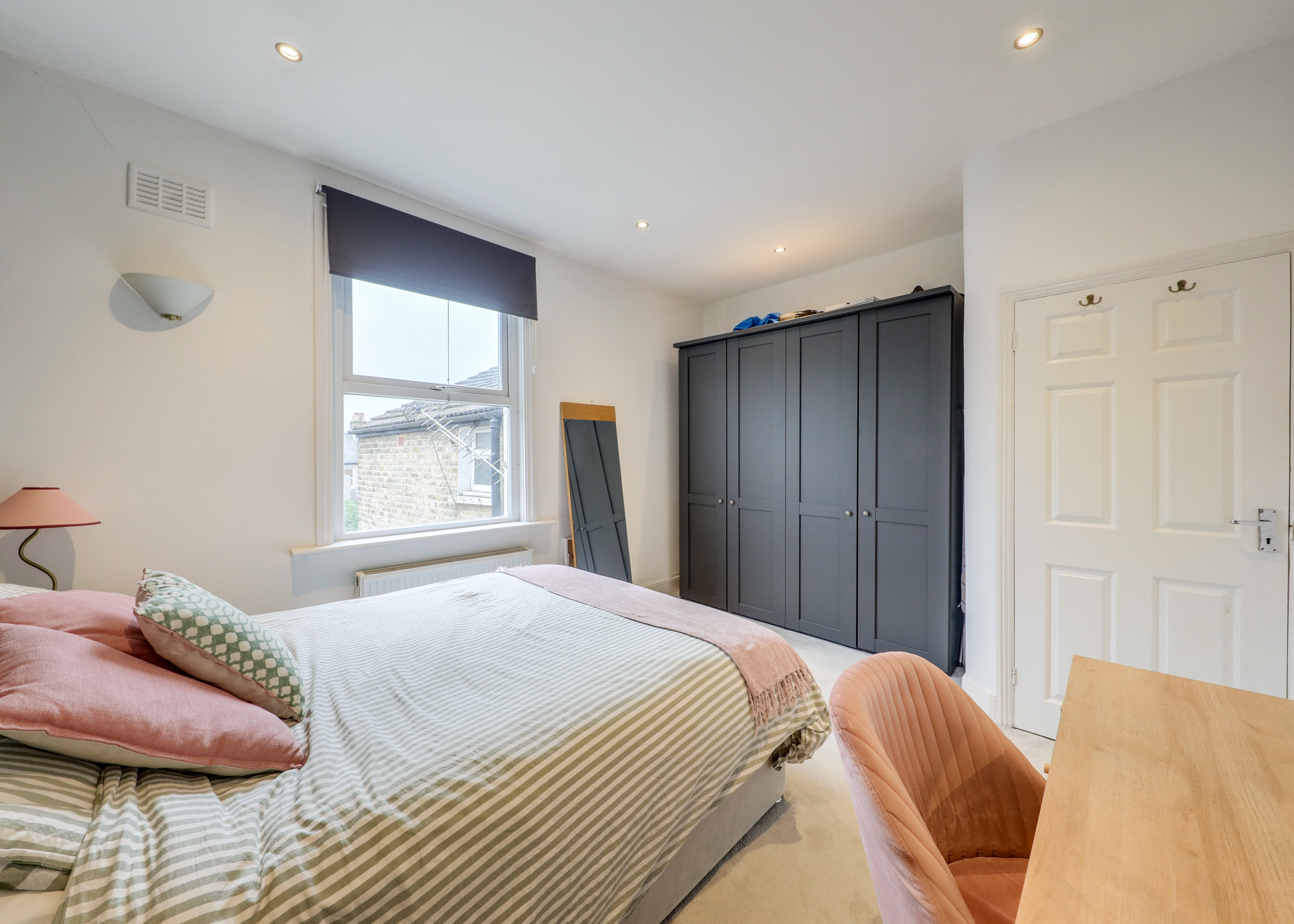 Double-glazed window, inset ceiling spotlights, wall-mounted lights, radiator, fitted carpet.