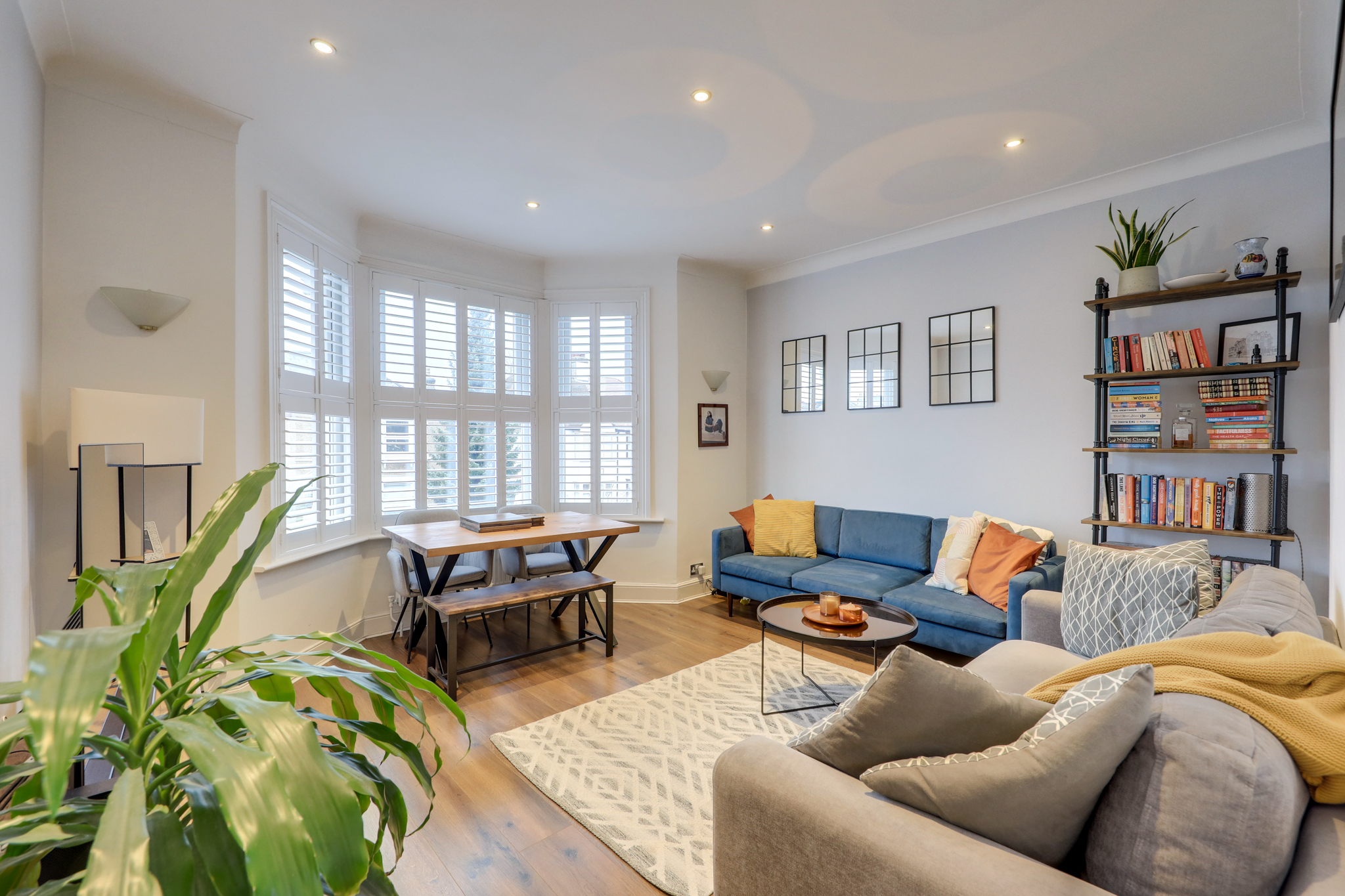 Double-glazed bay windows, fitted shutters, inset ceiling spotlights, wall-mounted lights, radiator, wood flooring.