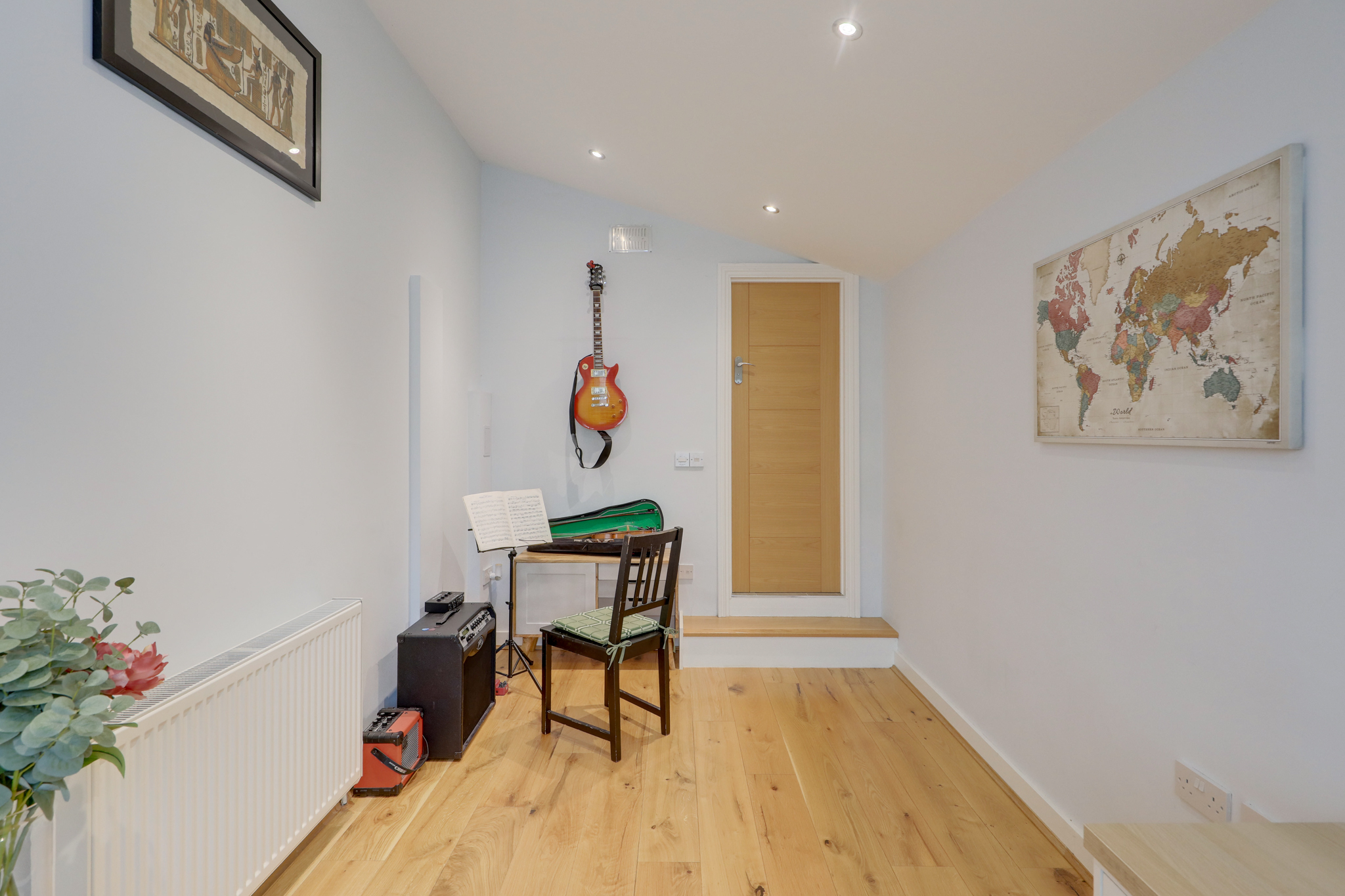 Spotlights, double-glazed window, radiator, wood floor.