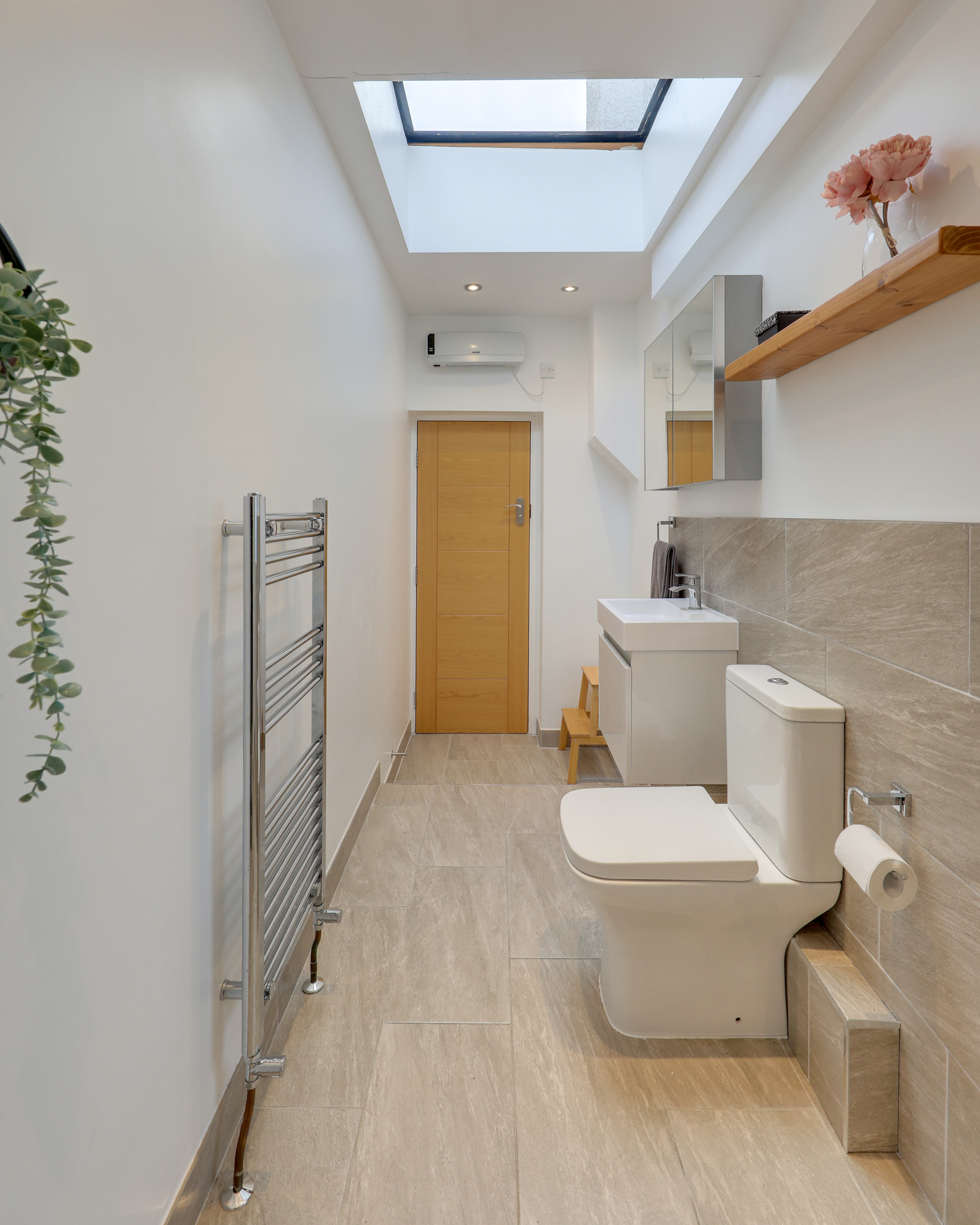 Spotlights, walk-in shower with glass door and wall mounter shower head, splash back tile, ceramic sink unit with, mixer tap, toilet, wall-mounted heated towel rail, laminate floor.