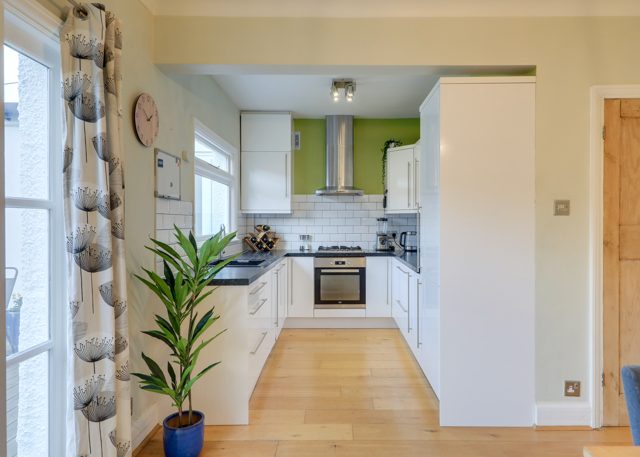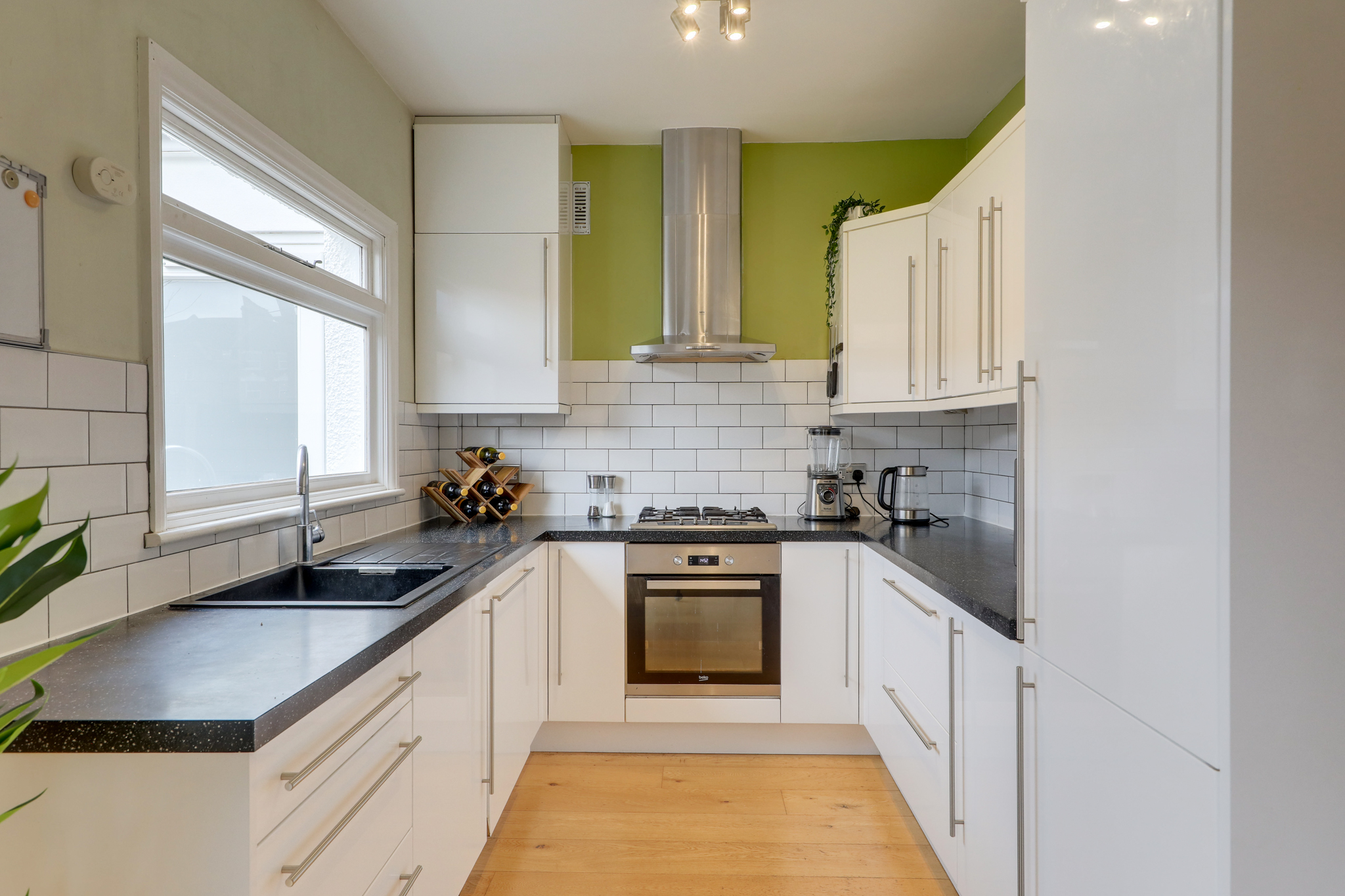 Pendant light, double-glazed window, half tile wall, matching wall and base units, integrated fridge, gas hob and oven, extractor fan, sink with mixer tap, wood floor.