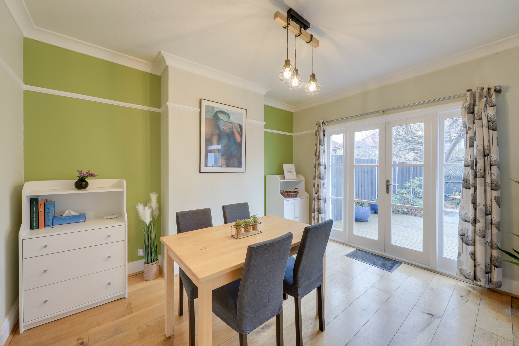Pendant lights, double-glazed door and windows, alcove space, wood floor.