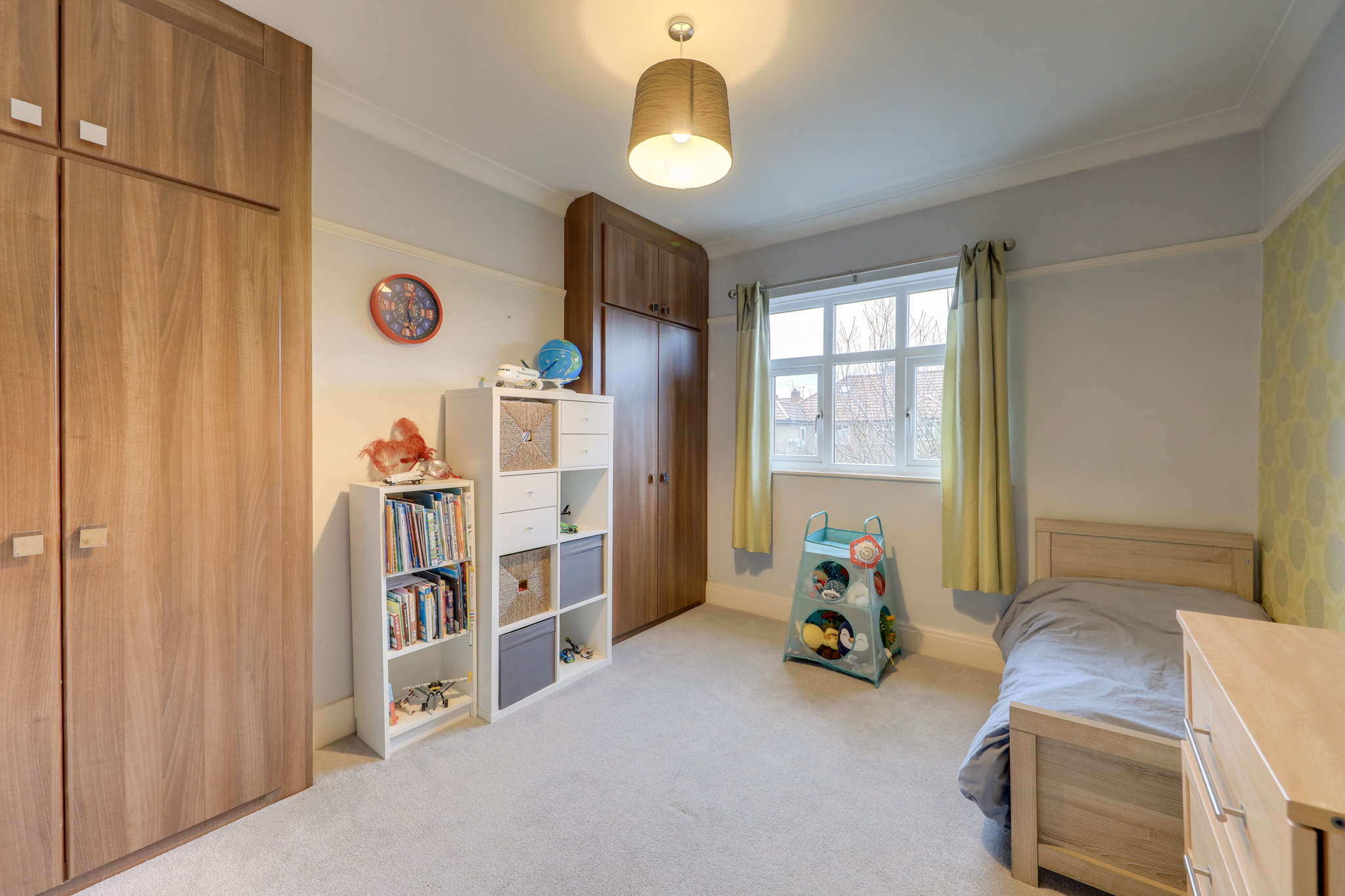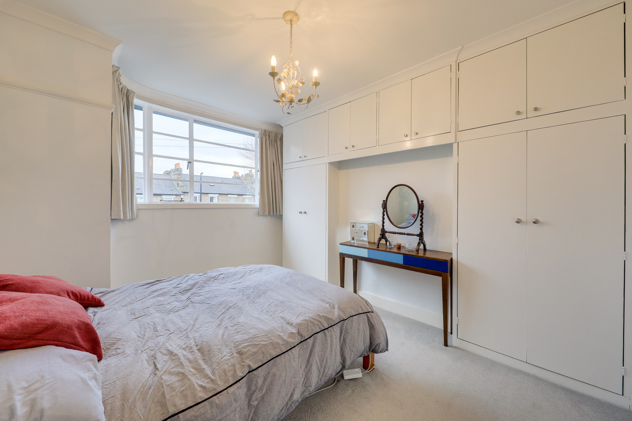 Pendant light, double-glazed window, fitted wardrobe and storage space, carpet.