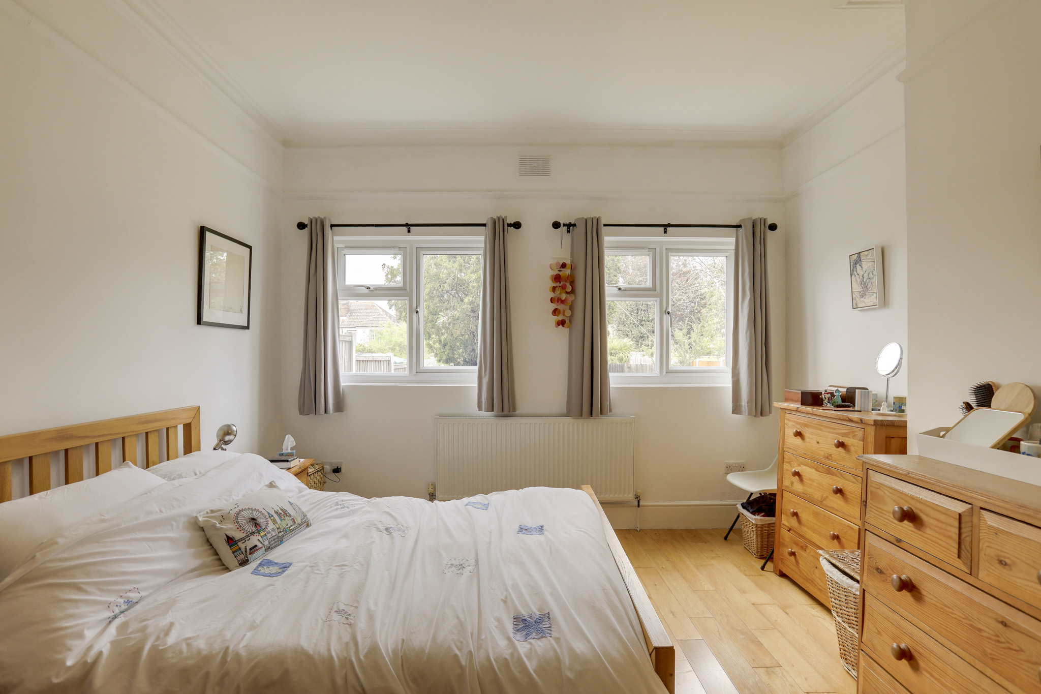 Double-glazed bay windows, pendant and wall mounted lights, radiators, wood flooring.