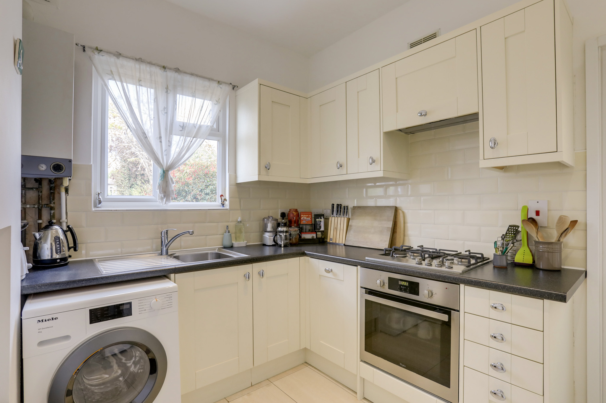 Double-glazed window, door to garden, ceiling light, fitted kitchen units, sink with mixer tap and drainer, integrated dishwasher, oven, gas hob and extractor hood, plumbing for washing machine, radiator, tile flooring.