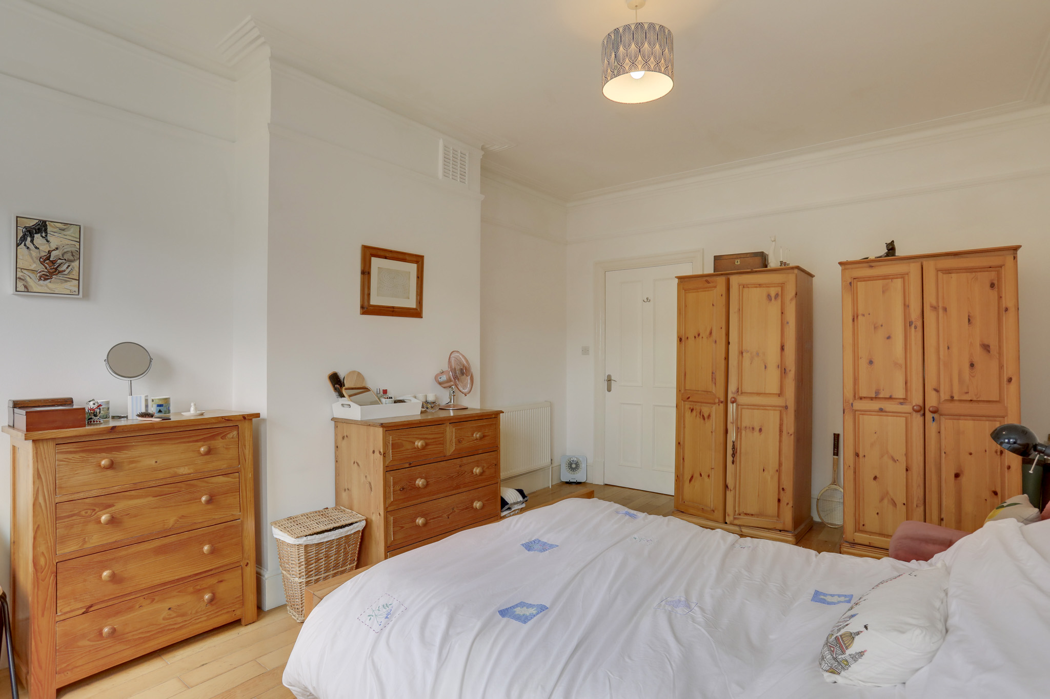 Double-glazed window, pendant ceiling light, storage cupboard, radiator, wood flooring.
