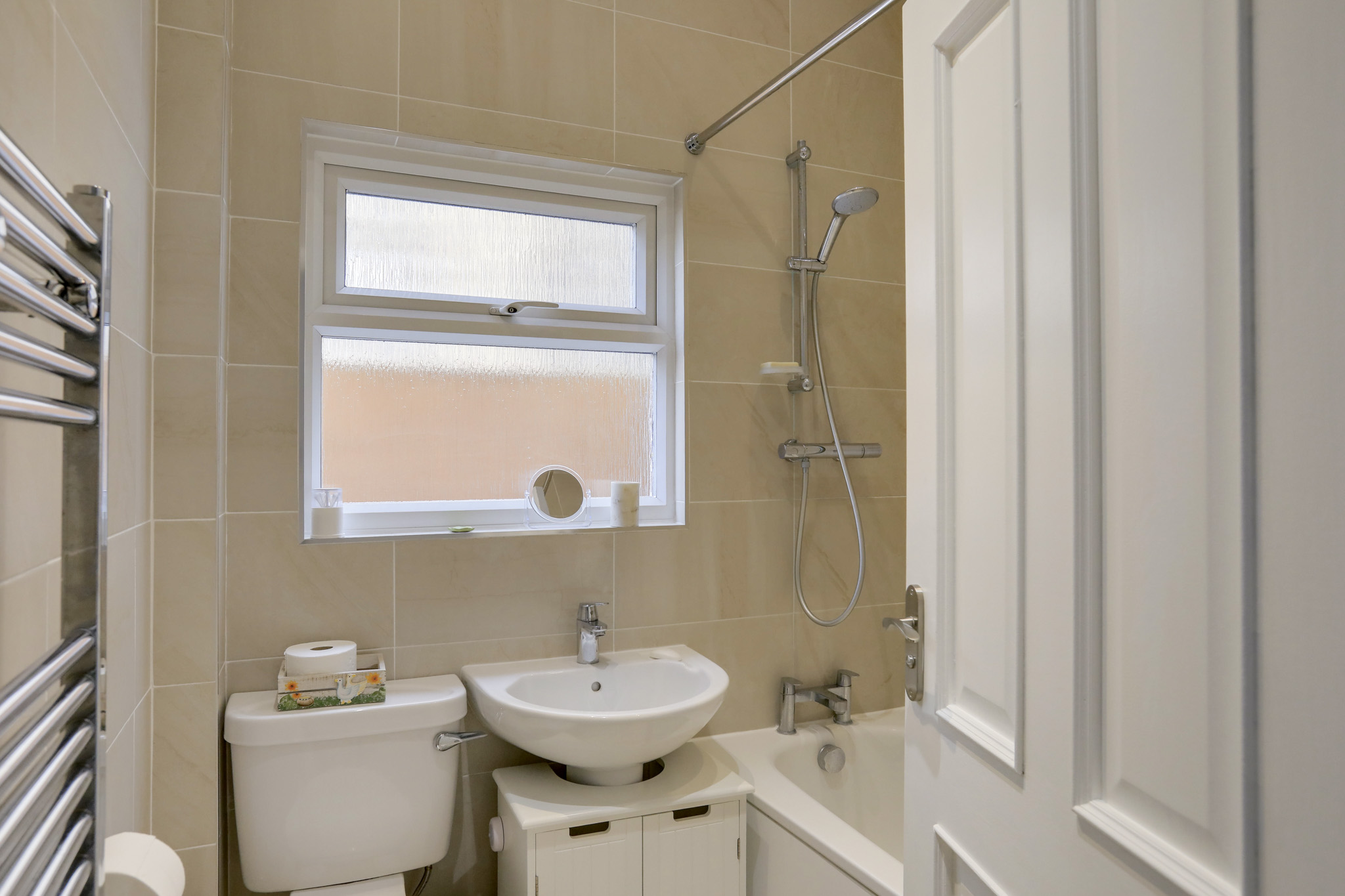 Double-glazed window, ceiling light, bathtub with shower, washbasin, WC, heated towel rail, tile flooring.