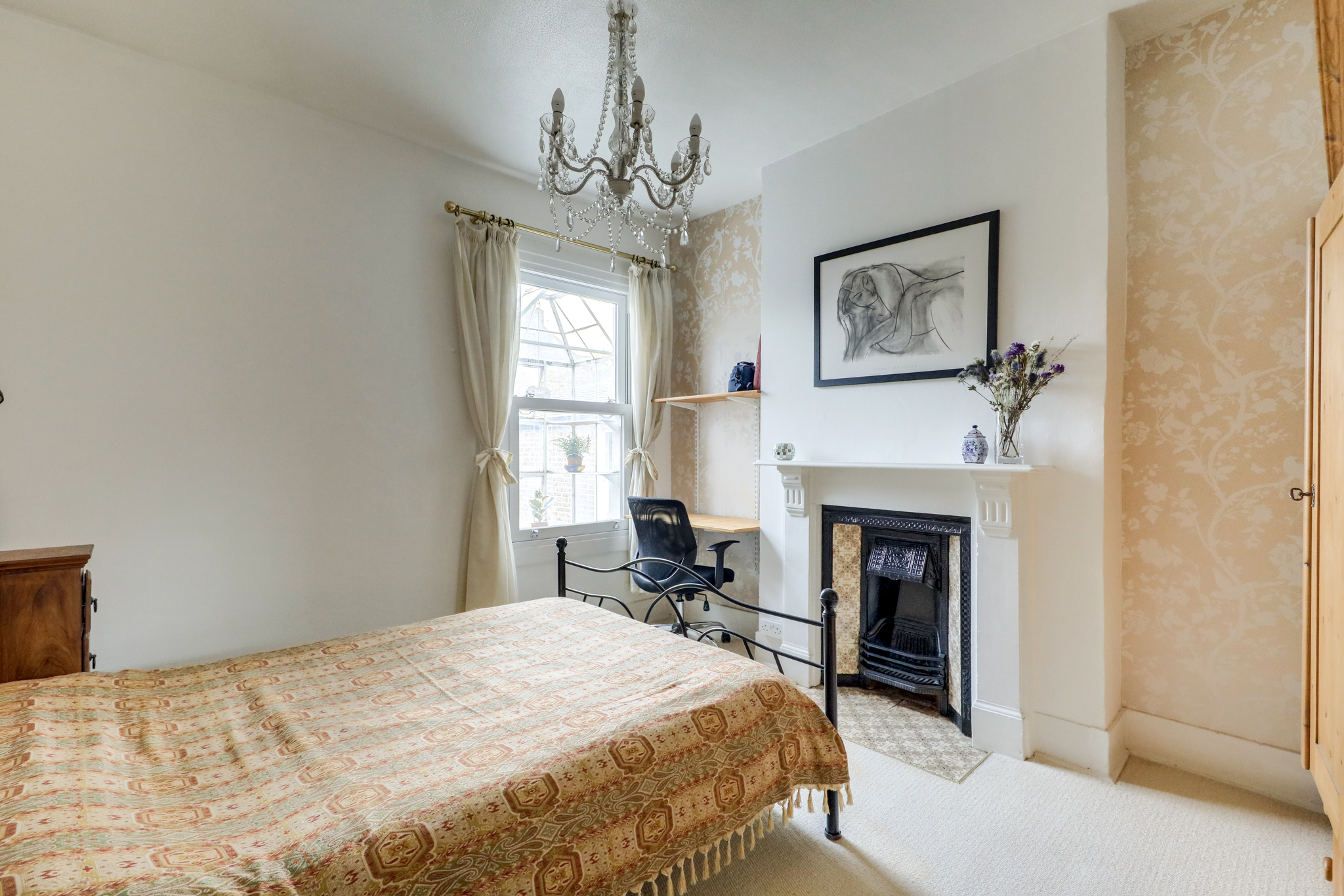 Sash window, chandelier ceiling light, fireplace, radiator, fitted carpet.