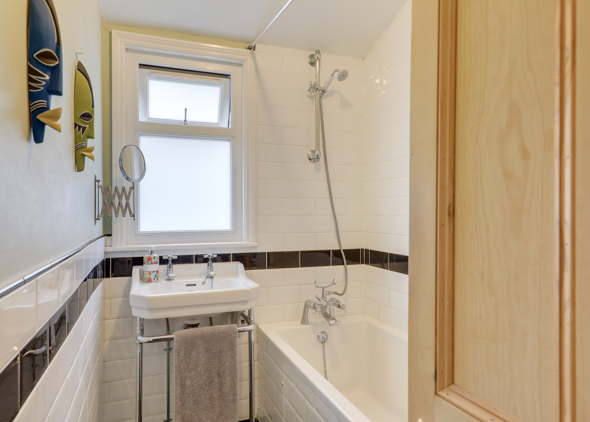 Double-glazed window, ceiling light, bathtub with shower, washbasin, heated towel rail, tile flooring.