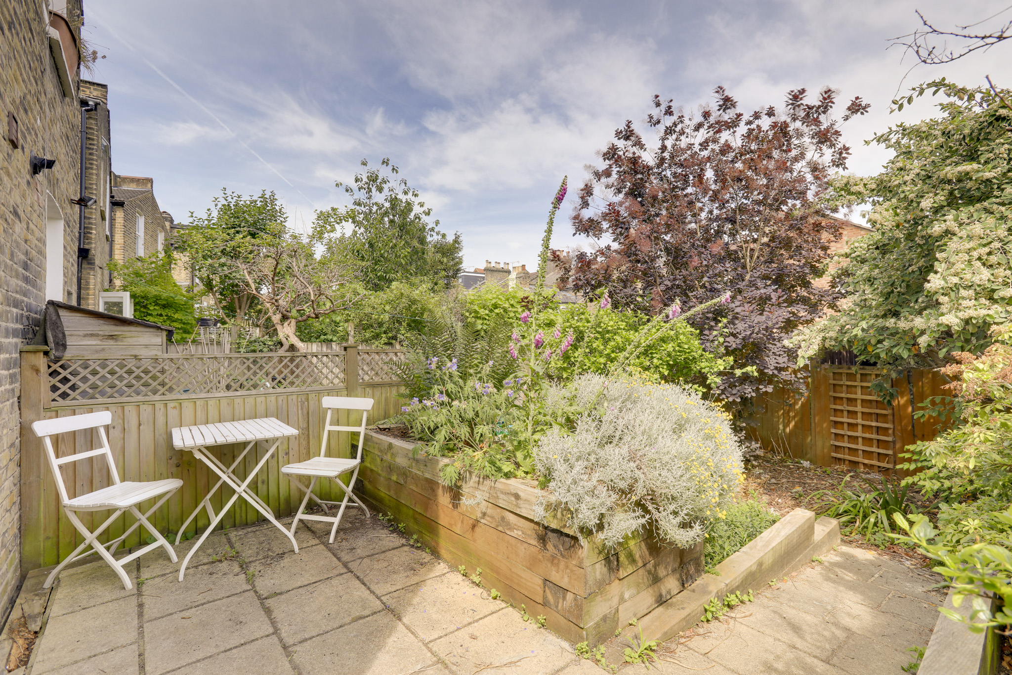 Paved patio leading to garden with raised plant beds.