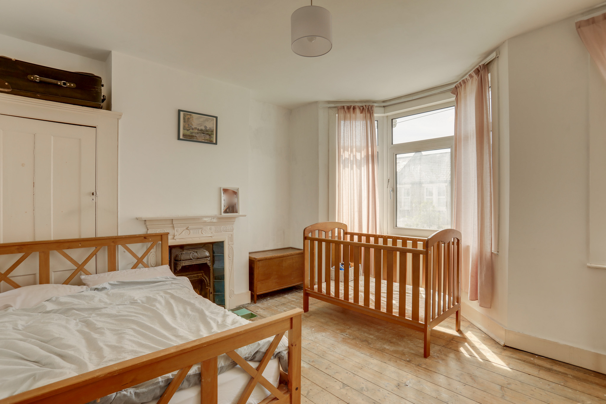Double-glazed window, pendant ceiling light, fireplace, storage cupboard, radiator, wood flooring.