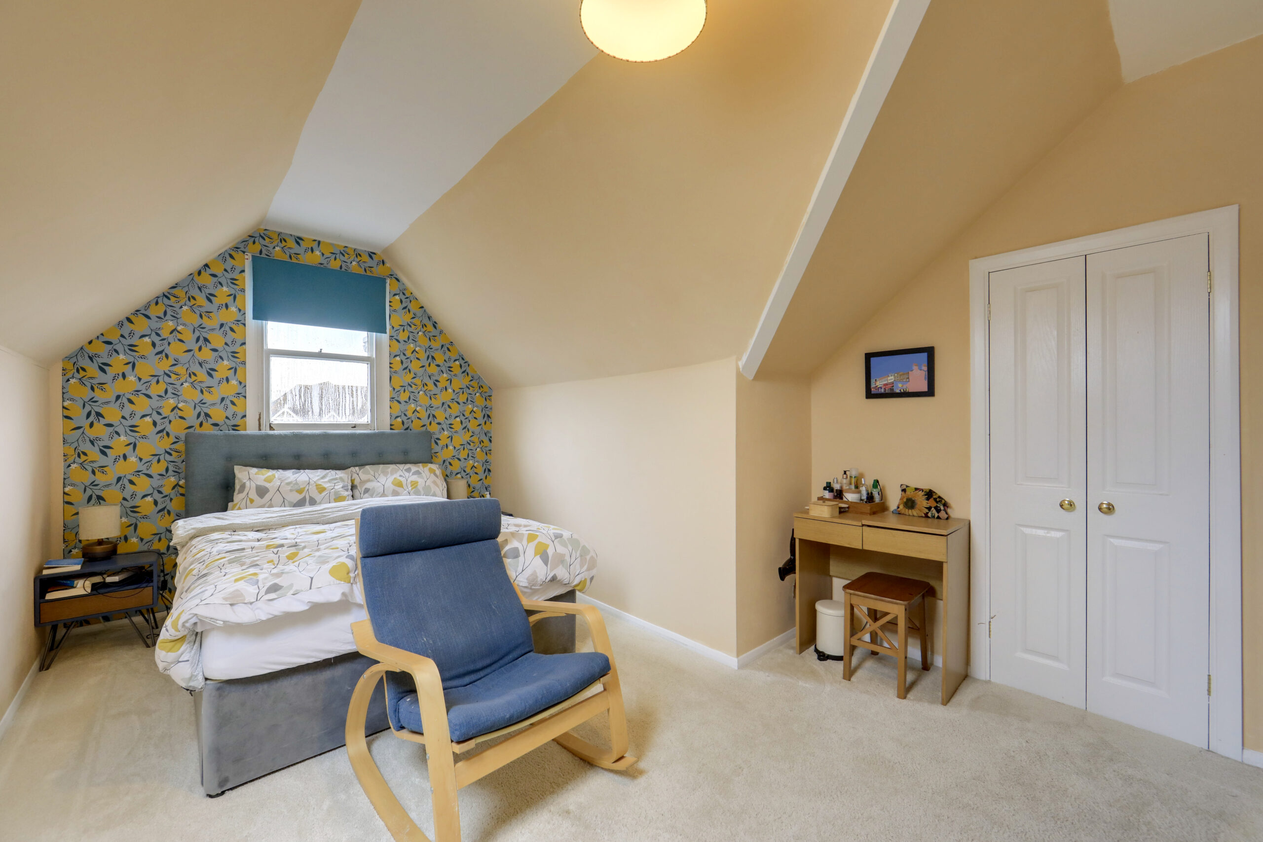 Pendant ceiling light, double glazed roof window to rear, access to eaves storage, radiator, fitted carpet.