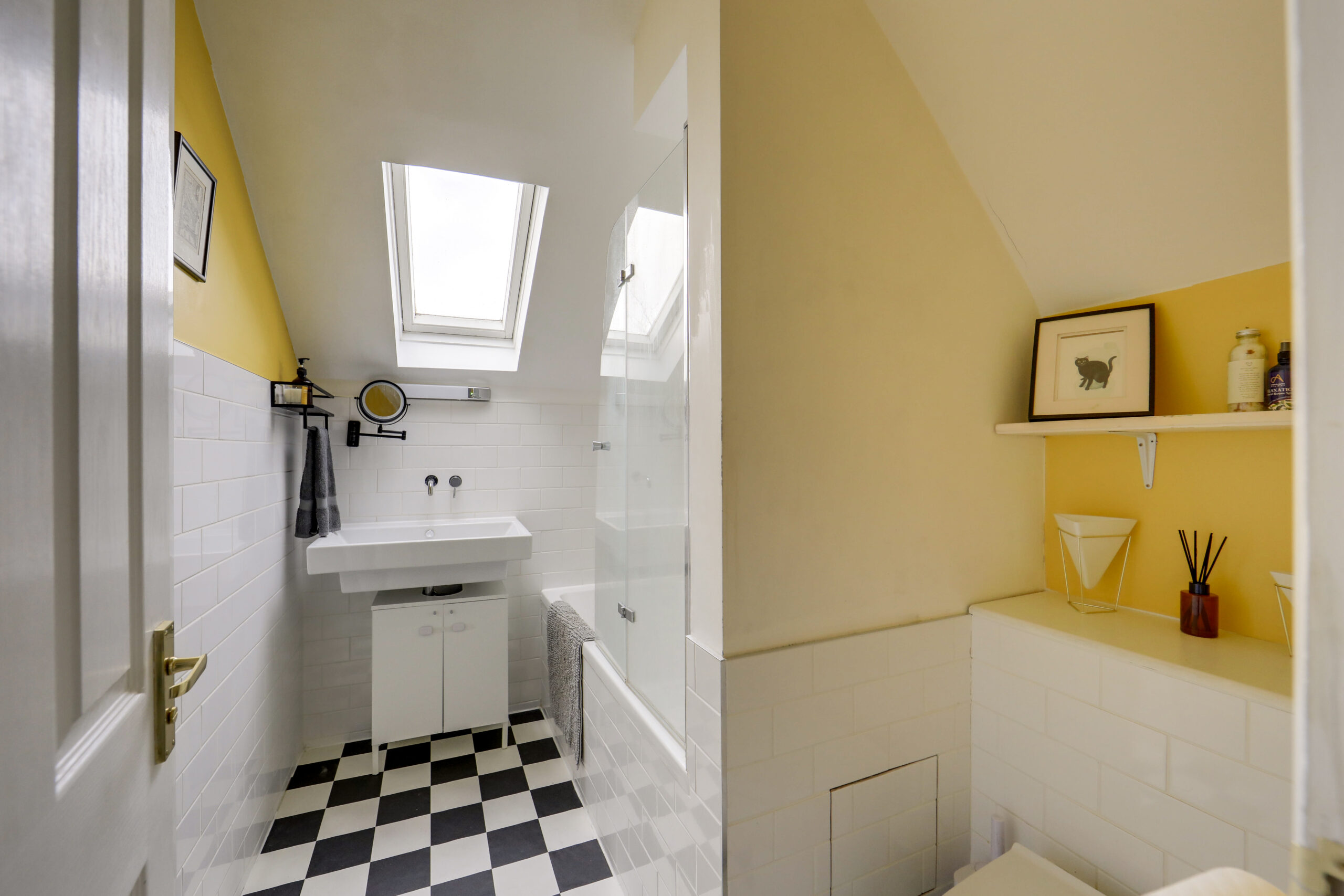 Ceiling light, double-glazed roof window to rear, bathtub with shower and screen, washbasin, WC, heated towel rail, vinyl flooring.