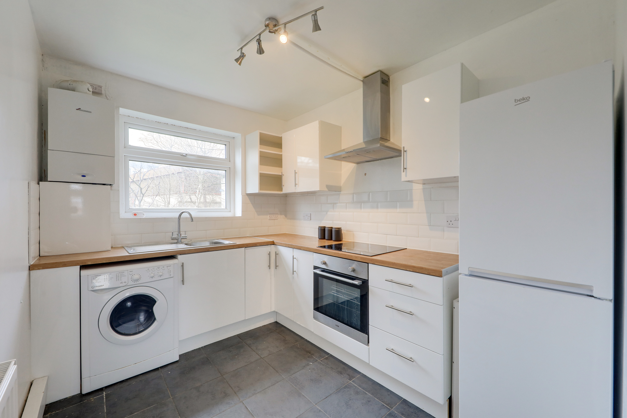 Double-glazed window, track ceiling light, fitted kitchen units, sink with mixer tap and drainer, integrated oven and electric hob, extractor hood, plumbing for washing machine, radiator, combi boiler, tile flooring.