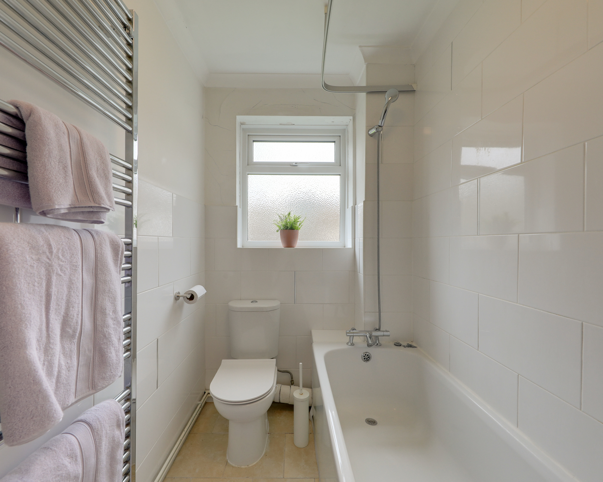 Double-glazed window, ceiling light, bathtub with shower, washbasin, WC, heated towel rail, tile flooring.