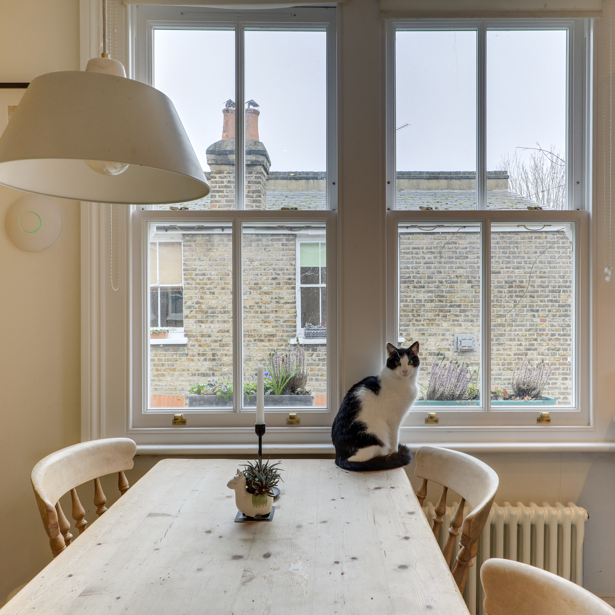 Pendant light, window, radiator, fitted wardrobe storage, carpet.