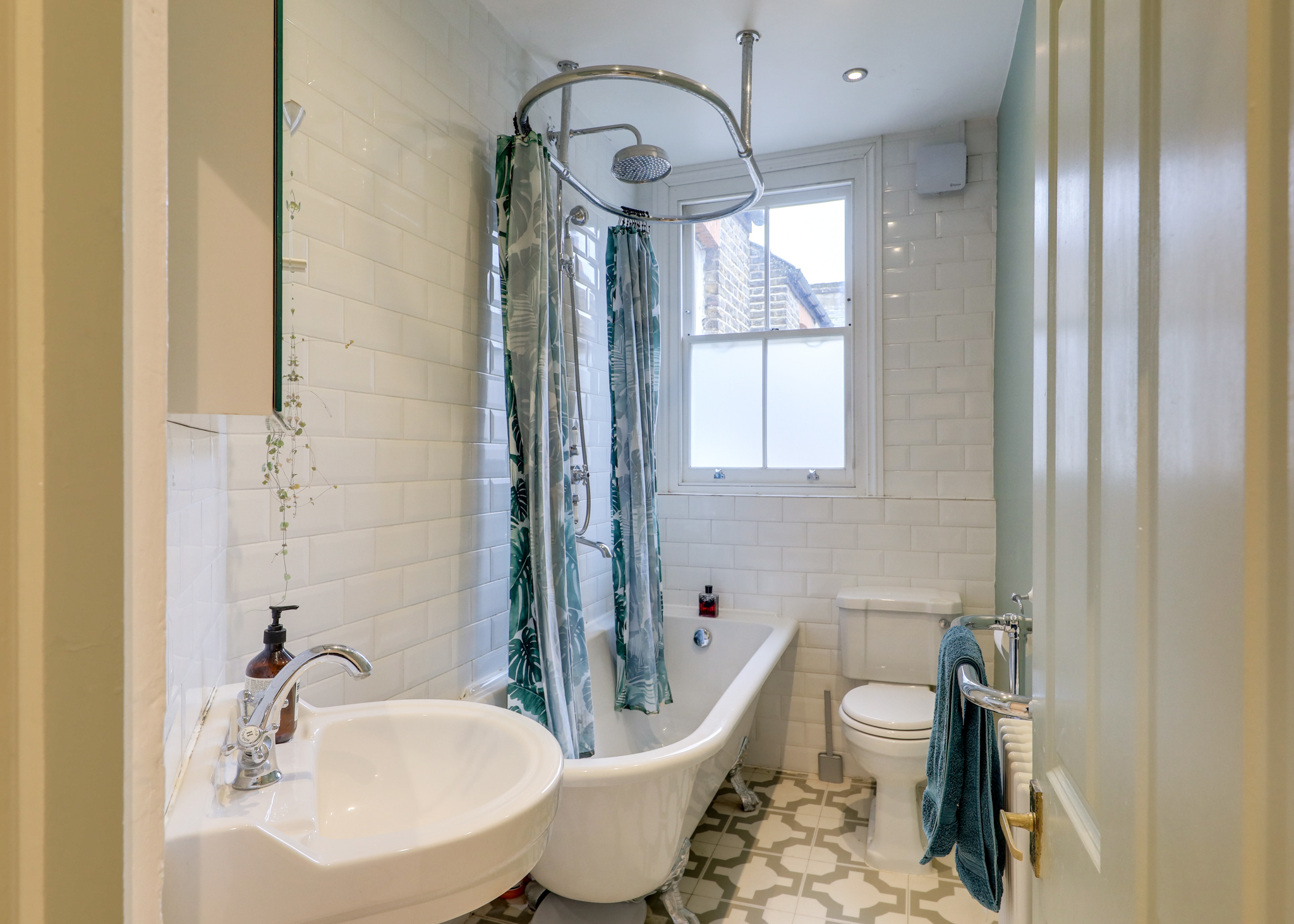 Spotlighting, window, tiled walls, matching 3-piece toilet, bath tub, sink with mixer taps, tile floor.
