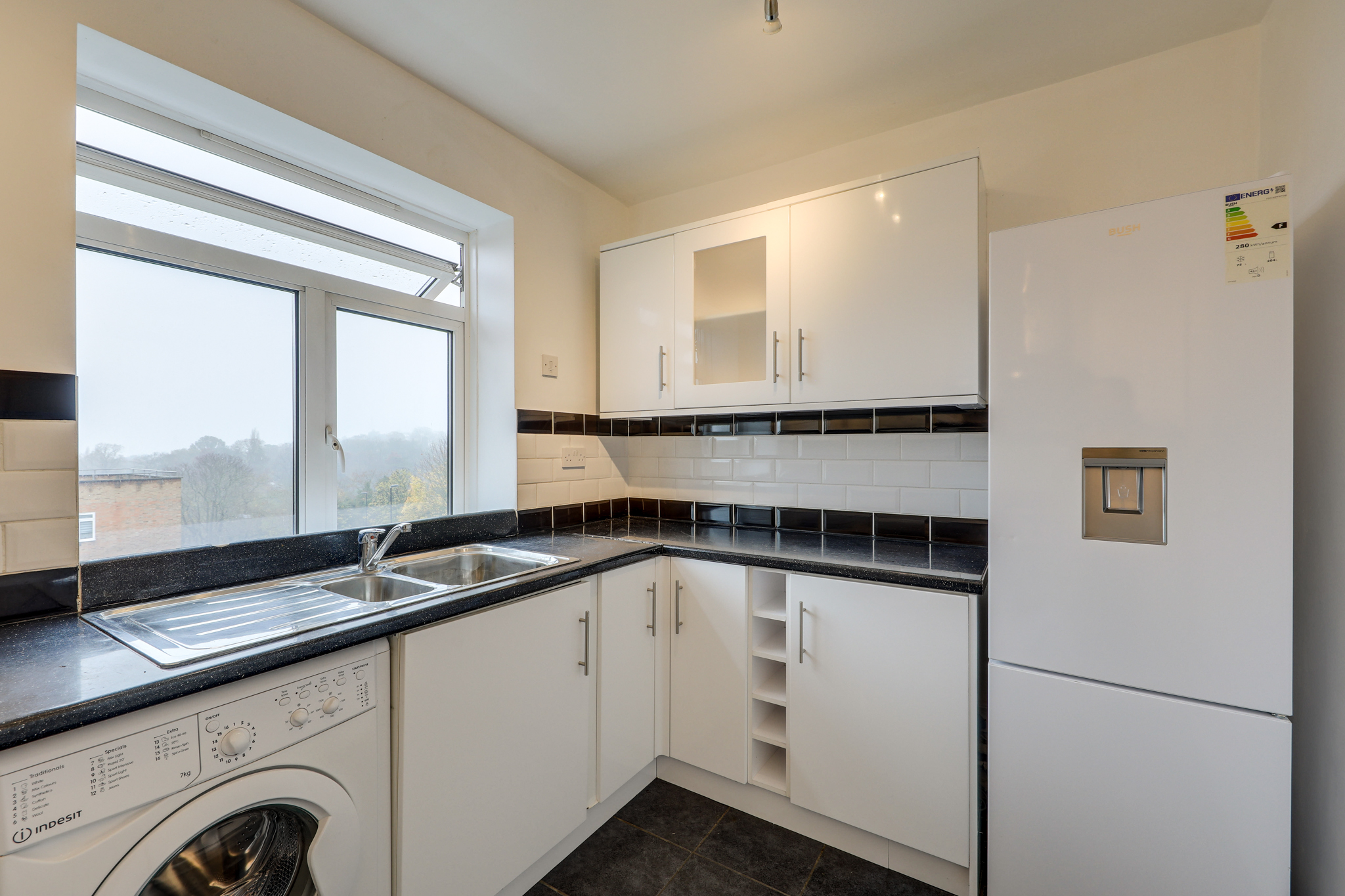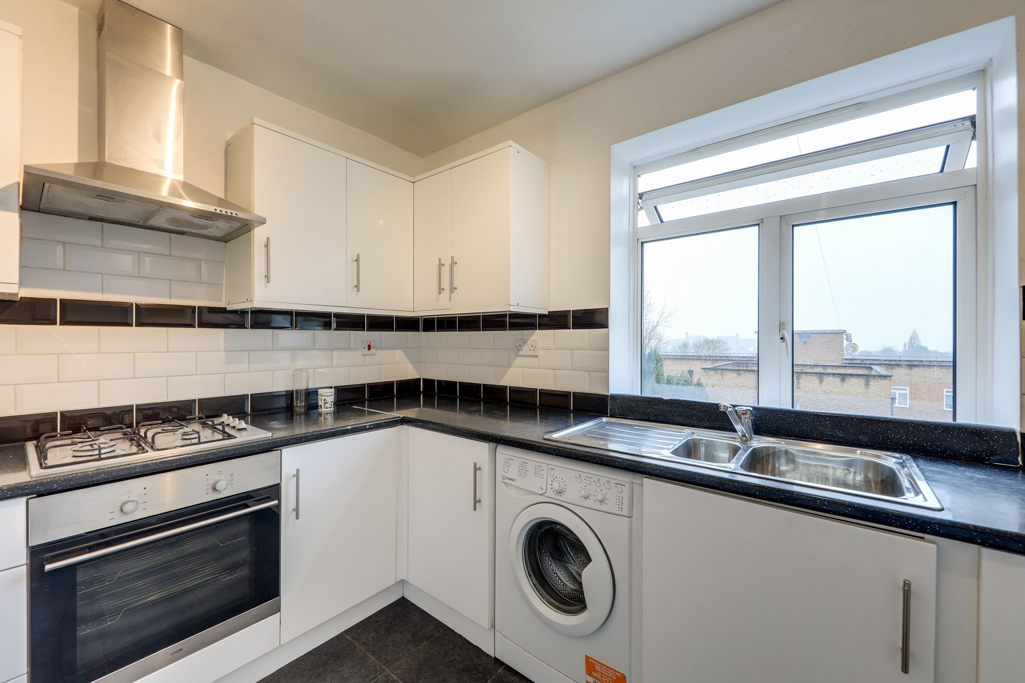 Double-glazed windows, track ceiling light, fitted kitchen units, 1.5 bowl sink with mixer tap and drainers, integrated oven and gas hob, plumbing for washing machine, tile flooring.