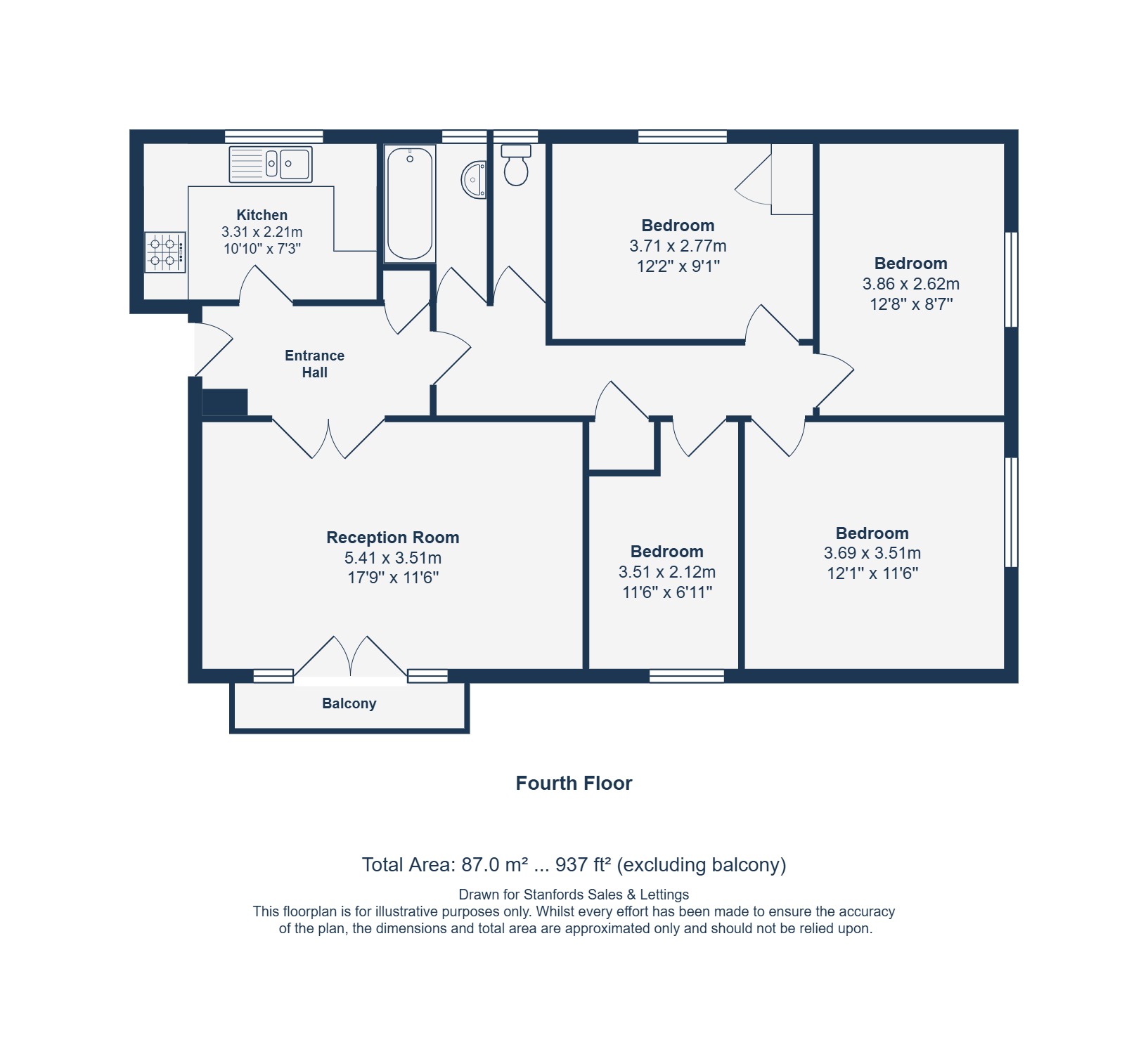 Set on the fourth floor, the property is well presented throughout and offers larger-than-average living space. The flat features a bright and airy reception room with French doors opening onto a private balcony, a modern kitchen, and four well-proportioned bedrooms. The bathroom is contemporary, complemented by a separate WC, and the property benefits from ample built-in storage. Residents also enjoy off-street parking and well-kept communal grounds.